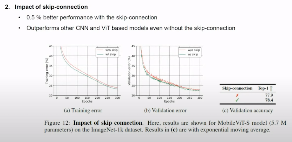 skip-connection의 영향입니다. skip-connection을 했을 때가 하지 않았을 때보다 0.5% 더 성능이 높았고 skip-connection을 쓰지 않은 경우에도 CNN과 ViT보다 성능이 더 좋은 것을 확인할 수 있습니다.