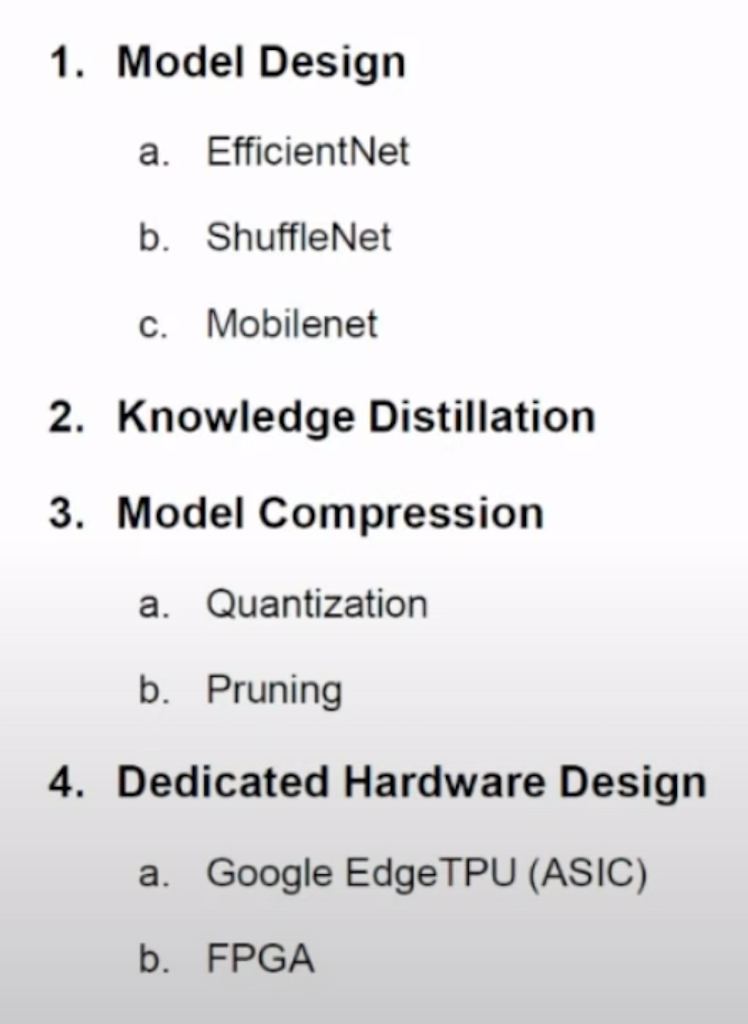 한정된 자원으로 최대한의 성능을 내야 되기 때문에 나온 여러 가지 경량화 방법들입니다. 첫 번째로 모델 자체를 가볍게 설계하는 EfficientNet이나 MobileNet 등이 있습니다. 두 번째는 Knowledge Distillation입니다. Knowledge Distillation을 사용을 해서 좀 더 무겁고 정확도가 높은 모델 말 그대로 지식을 증류하는 방식입니다. 세 번째로는 Model Compression입니다. Quantization이나 Pruning을 통해서 모델을 압축하는 방식입니다. 마지막으로 Dedicated Hardware Design은 Hardware 레벨에서 AI 연산에 최적화된 칩을 설계합니다.