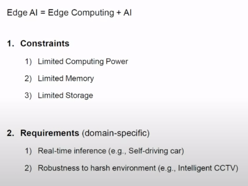 Edge AI는 예측 computing과 AI를 조합한 단어입니다. 이름에서 알 수 있듯이 서버 환경에 비해서 computing Power나 Memory 그리고 Storage에 제약이 있습니다. 반면에 제약에 비해서 도메인에 따라서 다르지만 Real-time inference을 요구하거나 극한 환경에 Robust 한 정확도가 요구됩니다. 대표적으로 자율주행이나 지능형 CCTV 등이 있습니다.