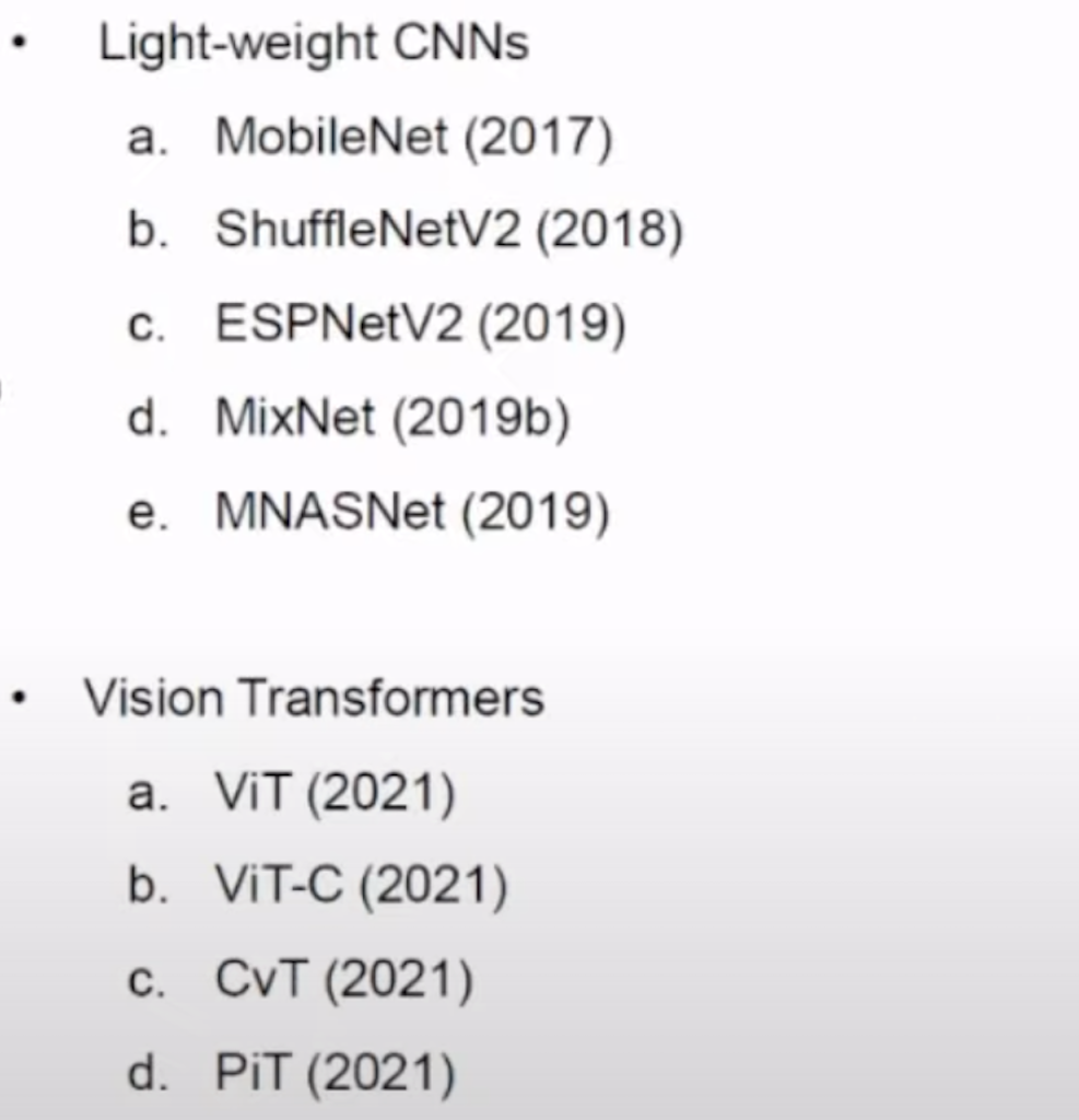 Related work입니다. Light-weight CNN는 MobileNet이나 MNASNet 등등이 있습니다. Transformer는 ViT를 시작으로 Convolution 하고 ViT를 조합하려는 시도들인 ViT-C나 CvT, PiT 등등이 있습니다.