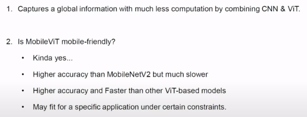 결론입니다. Mobile ViT는 결국에 CNN과 ViT를 조합을 함으로써 좀 더 적은 수의 연산으로 global information을 포착하는 모델이라고 볼 수 있습니다. Mobile ViT 보다는 확실히 느리긴 하지만 높은 정확도를 달성을 하고 다른 ViT 기반 모델에 비해서는 정확도랑 속도 측면에서 더 나은 것을 확인할 수 있었습니다.