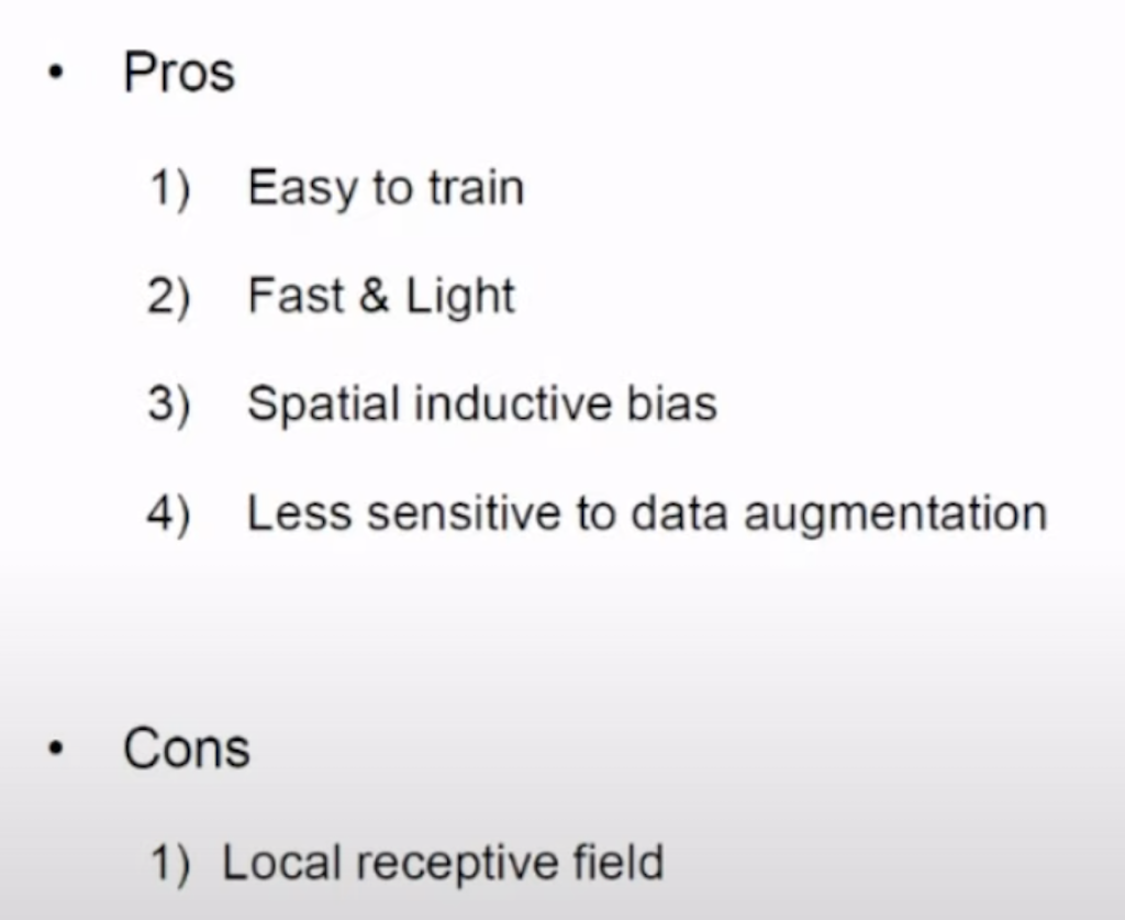 CNN의 장단점입니다. CNN은 Spatial inductive bias가 있어서 학습하기가 쉽고 가볍고 빠르다는 장점과 data Augmentation에 덜 민감하다는 것이 장점입니다.