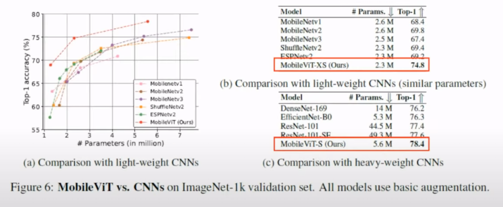 CNN과 비교한 표입니다. 동일한 parameter 하에서 accuracy가 높게 나온 것을 확인할 수 있습니다. 또한 애초에 가볍게 설계된 MobileNet 같은 모델에 비해서도 accuracy가 훨씬 더 높았고 heavy 한 모델에 대해서도 좀 더 나은 성능이 나왔습니다.