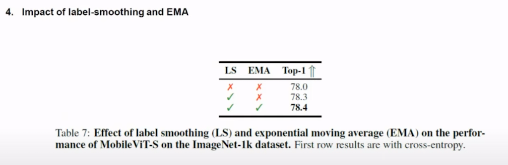 마지막으로 label-smoothing과 EMA를 적용한 결과입니다. label smoothing을 적용하면 3% 향상, 그리고 EMA까지 적용을 하면 +0.1%가 향상된 것을 확인할 수 있습니다.