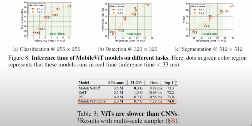 MobileNet2에 비해 느린 이유입니다. device는 iPhone12- CPU, iPhone12-Neural Engine, NVIDIA GPU에 대해서 테스트했습니다. Transformer 연산에서 일반적인 NVIDIA GPU에서는 CUDA kernel이 최적화되어 있지만 Mobile device 같은 경우에는 그렇지 않아서 MobileNet 2 하고 차이가 난다라고 설명하고 있습니다. 그리고 CNN는 워낙 오래된 연산이기 때문에 device 레벨에서 굉장히 최적화가 잘 돼 있어서 batch norm과 fusion 연산을 해서 따로 계산할 필요 없이 굉장히 최적화가 잘 돼 있다고 설명하고 있습니다.