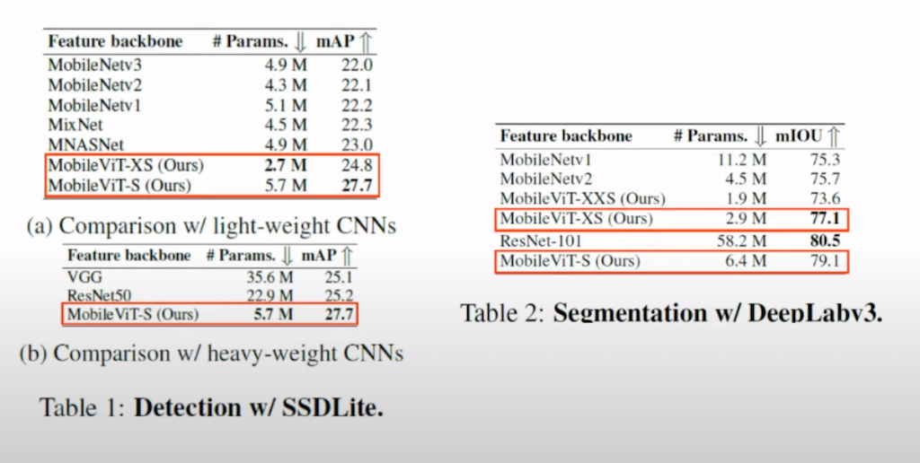 논문에서 목표로 했던 설계 목표 중의 하나인 Generalization probability입니다. Mobile ViT라는 모델이 단순히 classification에만 성능을 발휘하는 것이 아니라 detection이나 segmentation에 대해서도 backbone으로 사용됐을 때 좋은 성능을 발휘하는 것을 목표로 했습니다. 그래서 실험 결과 detection과 segmentation에 대해서도 뛰어난 성능을 달성한 것을 확인할 수 있었습니다.