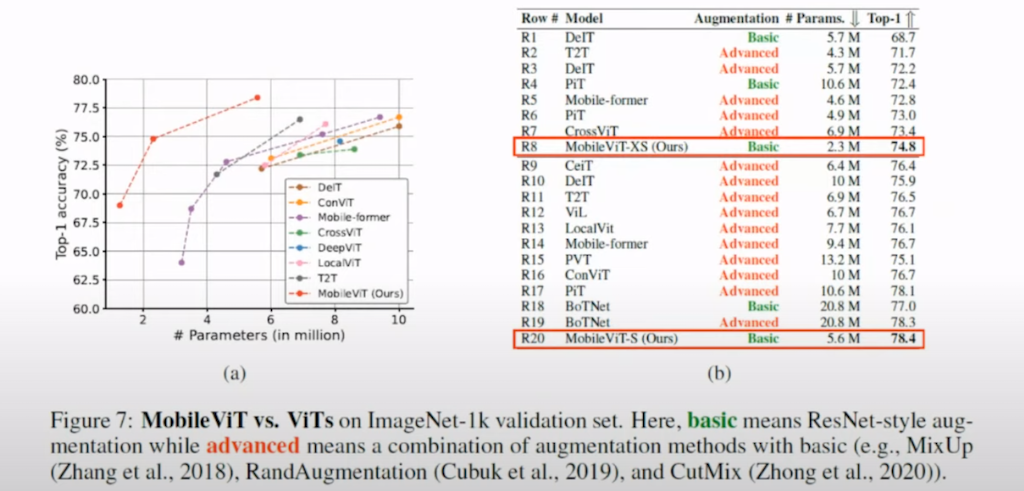 ViT 기반 모델과 비교한 표입니다. DeIT나 ViT, Pit 등등 고도의 augmentation을 쓴 모델에 비해서 Mobile ViT가 단순한 augmentation을 썼음에도 훨씬 적은 parameter로 높은 성능을 달성한 것을 확인할 수 있습니다.