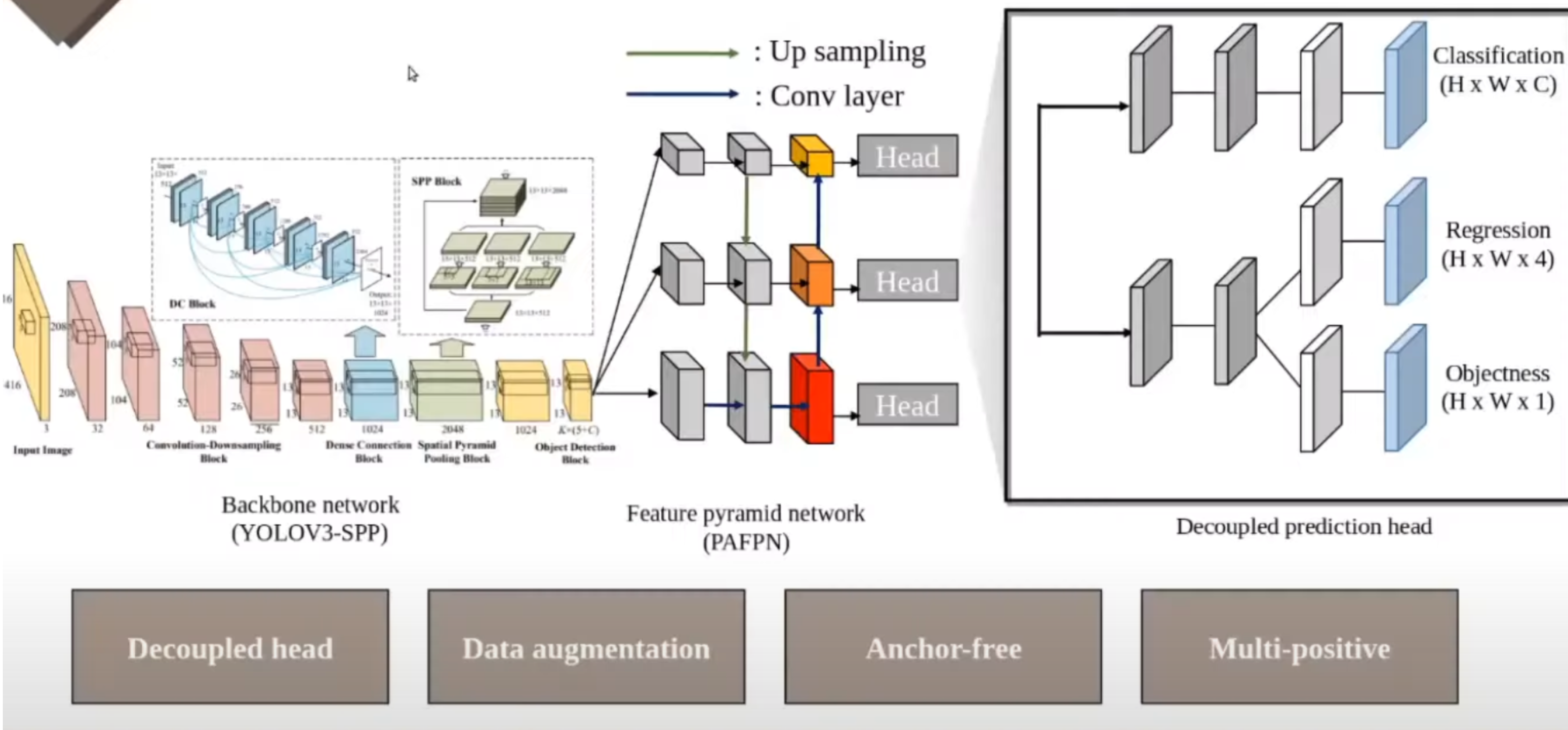 YOLOX의 네트워크 부분을 살펴보겠습니다. 전체적인 네트워크 구조를 나타내 보았습니다. YOLOX는 backbone 네트워크로는 YOLOV3의 spp를 탑재한 backbone 네트워크를 사용을 하였습니다. 그 이후에는 PAFPN이라는 피라미드 네트워크로 연결하고 그다음에 prediction을 진행하는 구조로 되어 있습니다. backbone 네트워크부터 다시 살펴보자면, 앞에서 언급했던 그래프에서는 YOLO V5를 개량한 모델의 그래프를 제시를 하였는데, 여기서는 YOLOV3을 사용을 하고 있습니다. 논문에서는 그 이유를 YOLOV4나 V5는 Anchor base 메서드에 과적합 돼 있어서 Anchor free 메서드를 적용하기 위해서는 V3가 더 적합했기 때문이라고 밝히고 있습니다.