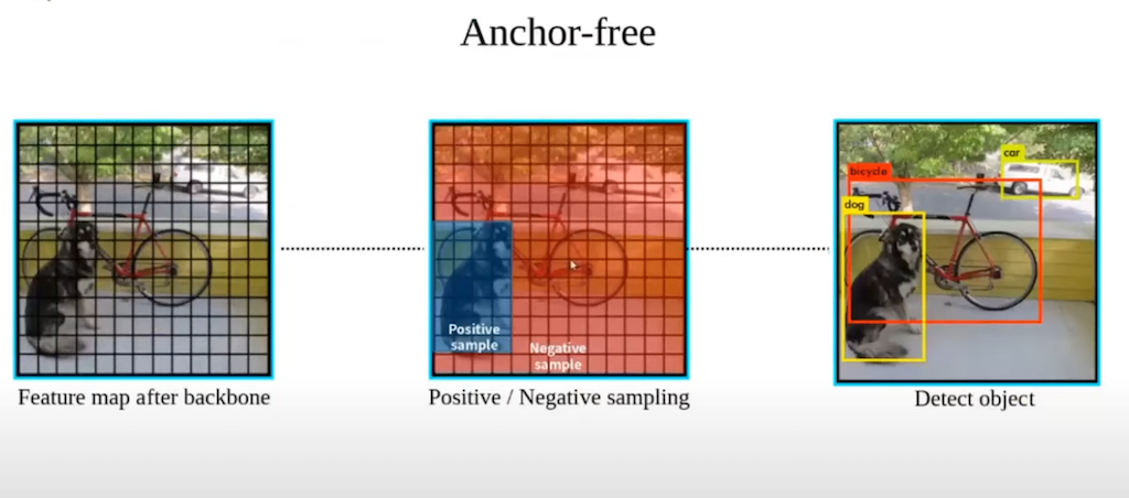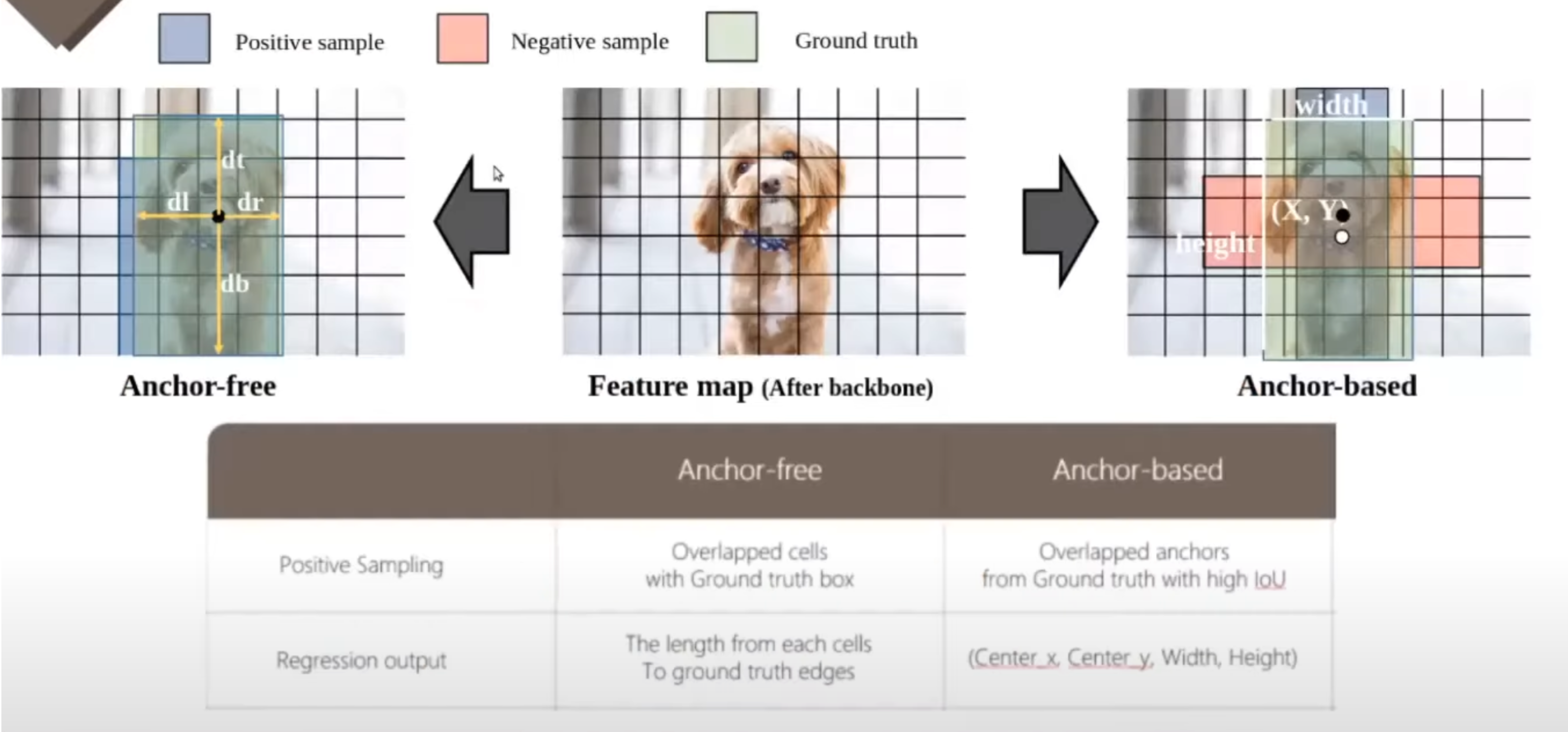다음으로 Anchor free 기법입니다. 중간 이미지가 그 feature map을 거친 backbone 네트워크를 거친 최종 feature map을 나타냅니다. 좌측이 Anchor free 그리고 우측이 Anchor base 방법을 나타내고 있습니다. Anchor base 방법부터 말씀을 드리자면, 위 그림 좌측의 검은 점이 있는 Cell에서 프레딕션을 진행한다고 가정을 했을 때, Anchor base 방법은 regression을 진행을 하고 regression에서 나오는 아웃풋 값을 바탕으로 Anchor의 중심점과 가로와 세로의 길이를 연산을 해서, 결과적으로는 bounding box에 가로 세로 길이와 중심점을 같은 것을 학습합니다. 여기서 빨간색 박스와 파란색 박스는 각각 Anchor가 만들어낸 bounding box를 의미합니다. 여기서는 아무래도 파란색 박스가 초록색 GT박스와 IoU가 높기 때문에, 이 파란색 bounding box가 Positive 샘플로 분류가 되고 빨간색 박스는 학습에 참여하지 않게 됩니다. 그리고 Anchor free 방법에서는 그라운드 트루스 bounding box 안에 있는 Cell들이 전부 Positive 샘플이 됩니다. 그래서 그중에서도 이렇게 검은 점에서 프레딕션을 진행한다고 했을 때, Anchor free 방법에서는 해당 Cell에서부터 GT의 각 모서리까지 길이를 학습을 하게 됩니다. 그래서 이를 바탕으로 bounding box를 만들어 내고 디텍션 테스크를 수행을 합니다.