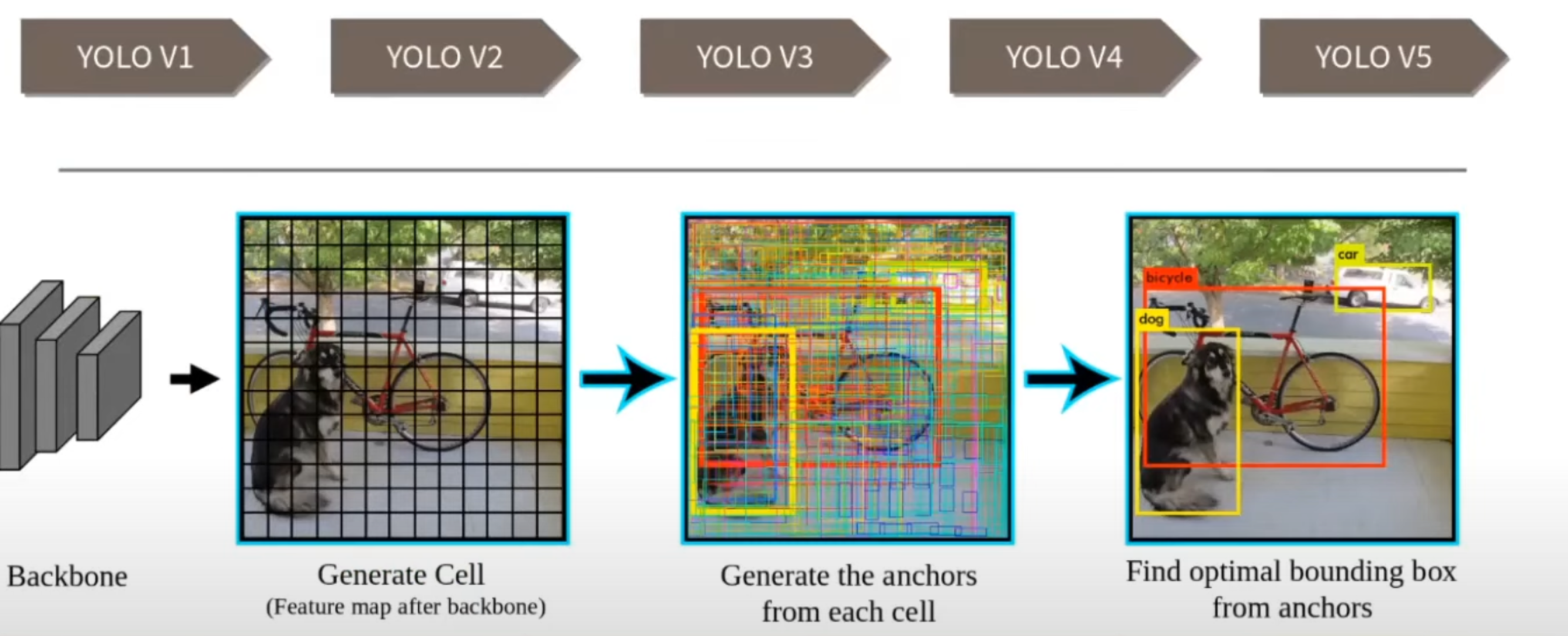 YOLO의 작동방식에 대해 설명드리겠습니다. YOLO는 시리즈별로 작동방식이 조금은 상이하지만 V1을 제외한 모든 버전에서는 공통적으로 사용되는 Anchor라는 특징이 있습니다. Anchor는 object detection을 할 때 다양한 비율과 다양한 크기의 오브젝트를 잘 잡아내기 위해서 도입이 되었습니다. Anchor를 간단히 말하면 bounding box를 만들어내기 위해 기반이 되는 설정값입니다. Anchor를 사용하는 방식은 위 그림들이 나타내고 있습니다. 첫 번째 단계로는 일반적인 네트워크와 같이 backbone을 통해서 feature extraction을 진행합니다. 위 그림에서는 13 * 13인데 바로 맨 마지막 backbone 아웃풋의 feature map의 shape이라고 생각을 해 주시면 될 것 같습니다. 피쳐 맵 각각의 한 칸 들을 YOLO에서는 Cell이라는 명칭으로 부릅니다. 따라서 본 예제에서 개수는 Cell이 169개라고 볼 수 있습니다. 그리고 각각의 Cell에는 depth를 포함하고 있습니다. 만약에 아웃풋 디멘션이 13 * 13 * 10이라면 Cell 하나의 shape은 1 * 1 * 10입니다. 각 Cell에서 Anchor를 만들어 내고 그 Anchor를 기반으로 다시 bounding box를 만들어내는 과정을 거치게 됩니다. Cell 각각에서 Anchor를 만들어 내고 bounding box를 다 만들어 내다 보니까 전부 다 visualization 하면, 위 그림과 같이 엄청나게 많은 bounding box가 생깁니다. 이 bounding box 후보군들 중에서 ground truth(GT)와 겹치는 accuracy가 높은 bounding box만 남기고, 그 bounding box 중에서도 또 좋은 것만 골라서, 결국에는 이렇게 원하는 레이블을 찾는 오브젝트의 영역을 디텍션 하는 방식이 됩니다. 결국 Anchor라는 것이 bounding box를 만드는 기반이 되고, 이것으로 bounding box를 만들어서 GT에 근접한 것들을 남기는 과정이라고 생각하시면 될 것 같습니다.
