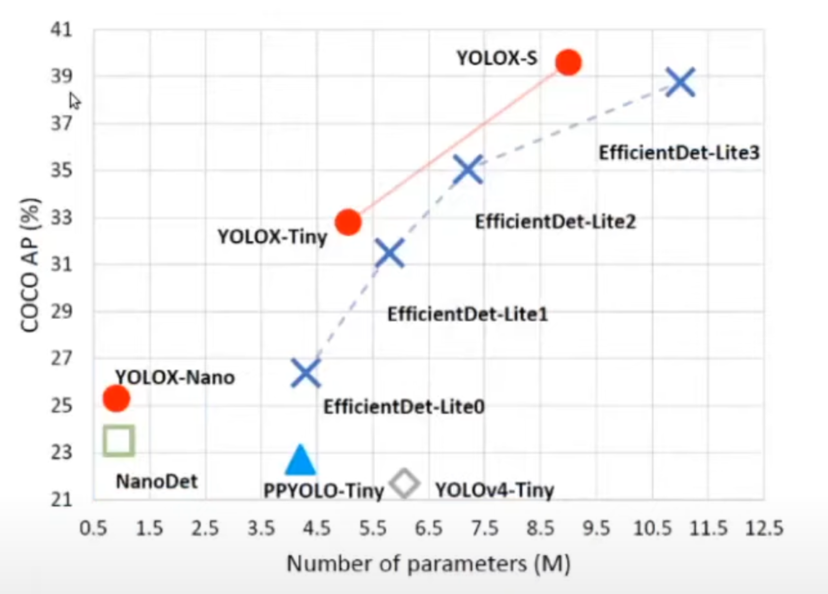 오른쪽 그림은 조금 작은 모델들에 Anchor free 방법을 적용한 그래프이고, 파라미터 대비 average precision을 나타내고 있는데, YOLOV4의 Tiny나 NanoDet 등에 적용해서, 원래 모델의 성능보다는 더 높은 성능을 보여주고 있습니다.
