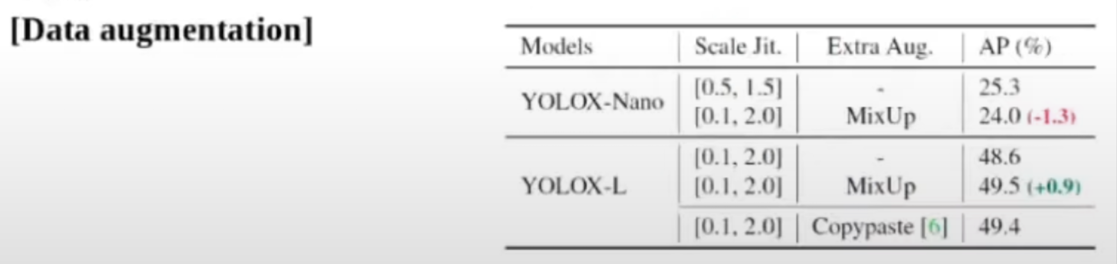 저자는 전체적으로 이러한 네트워크 위에 크게 4가지 방법을 가지고 성능 향상을 이끌어냅니다. 이렇게 헤드가 여러 개인 것을 뜻하는 Decoupled head와 데이터 증강인 Data augmentation 그리고 Anchor free Multi positive라는 방법을 적용했습니다. YOLOX 포스팅에서는 이렇게 4가지 항목을 중심으로 설명을 드리겠습니다.
