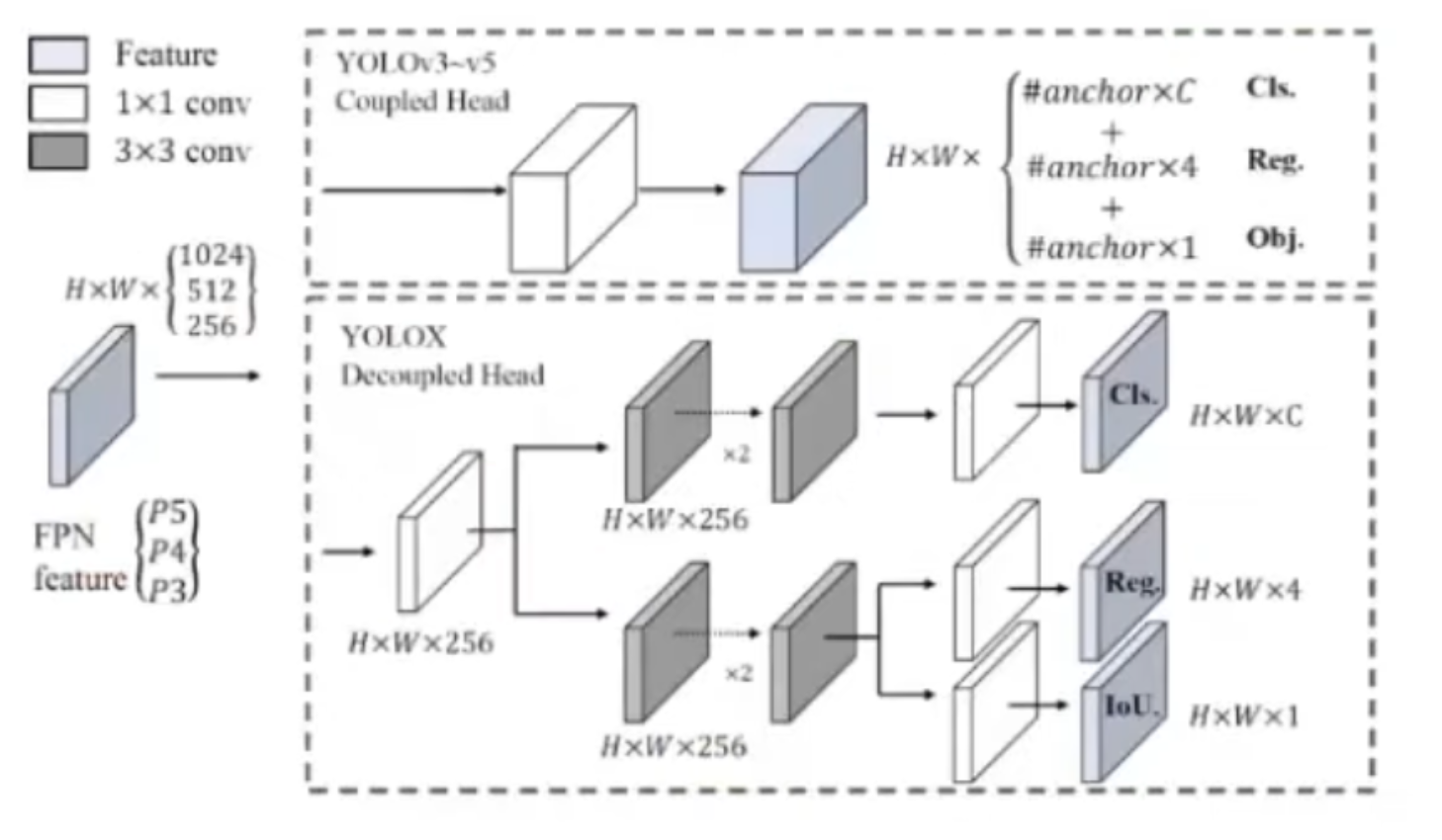 YOLOX에 적용한 기법 중 첫 번째로 Decoupled head가 있습니다. Decoupled head라는 것은 이름처럼 하나의 헤드가 아닌 여러 개 헤드로 나뉜 것을 의미합니다. YOLOV3부터 V5까지는 하나의 헤드만 사용을 했습니다. 즉, regression 파트, classification 파트, 그리고 Objectness파트까지 전부 합쳐서 하나의 벡터로 만들어서 학습을 하고 prediction을 하는 방법을 사용을 했습니다.