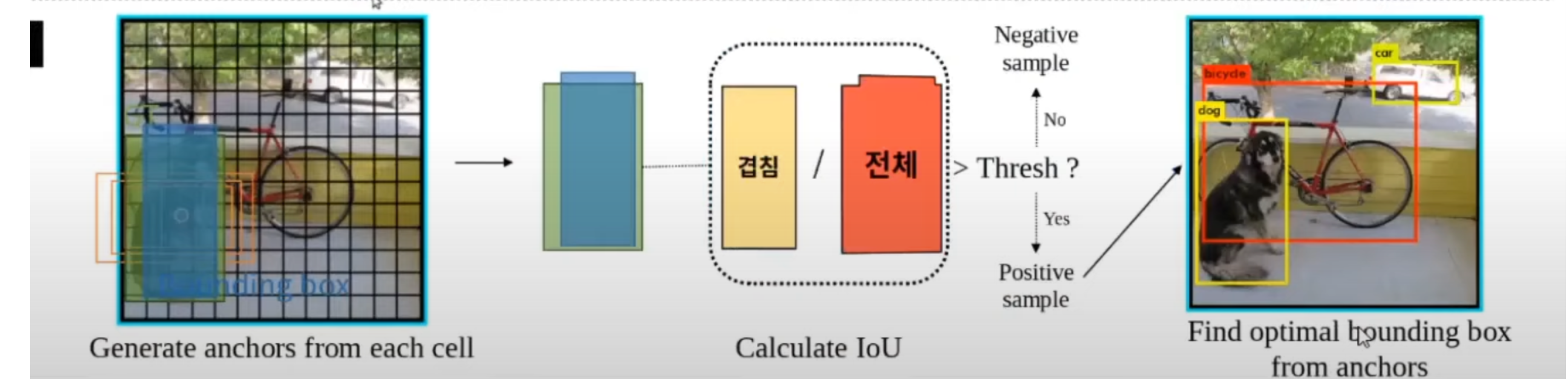 bounding box 또한 똑같은 개수로 만들어진다고 생각을 하시면 될 것 같습니다. 그림과 같이 만들어진 bounding box는 초록색 부분이 GT 부분이고 파란색 부분이 bounding box부분입니다. 그리고 GT와 이 bounding box와 얼마나 겹치는지 측정을 합니다. 얼마나 많이 겹치는지 를 나타내는 지표를 IoU 라고 합니다. IoU는 두 박스가 있을 때, 두 박스 전체영역 / 겹치는 영역으로 하나의 밸류를 만들어내서 밸류가 일정 이상이면 이것이 GT와 어느정도 근접한 bounding box를 예측했다 라고 생각을 해서 Positive 샘플로 분류를 하게 되고, Positive 샘플들을 모아서 학습을 진행을 하게 됩니다. 여기까지 진행하면 마지막에 후보군 bounding box들 중에서 조금 더 accuracy가 높은 것들만 추려내면 깔끔하게 bounding box가 남는 과정이 진행됩니다. 이런 방식으로 Anchor를 통해서 bounding box를 만들어 내고, 학습을 진행하는 만큼 Anchor base 메서드는 recall은 조금 높지만 계산량이 많고 Negative 샘플이 많기 때문에, class imbalance problem이 가중되는 단점이 있습니다.