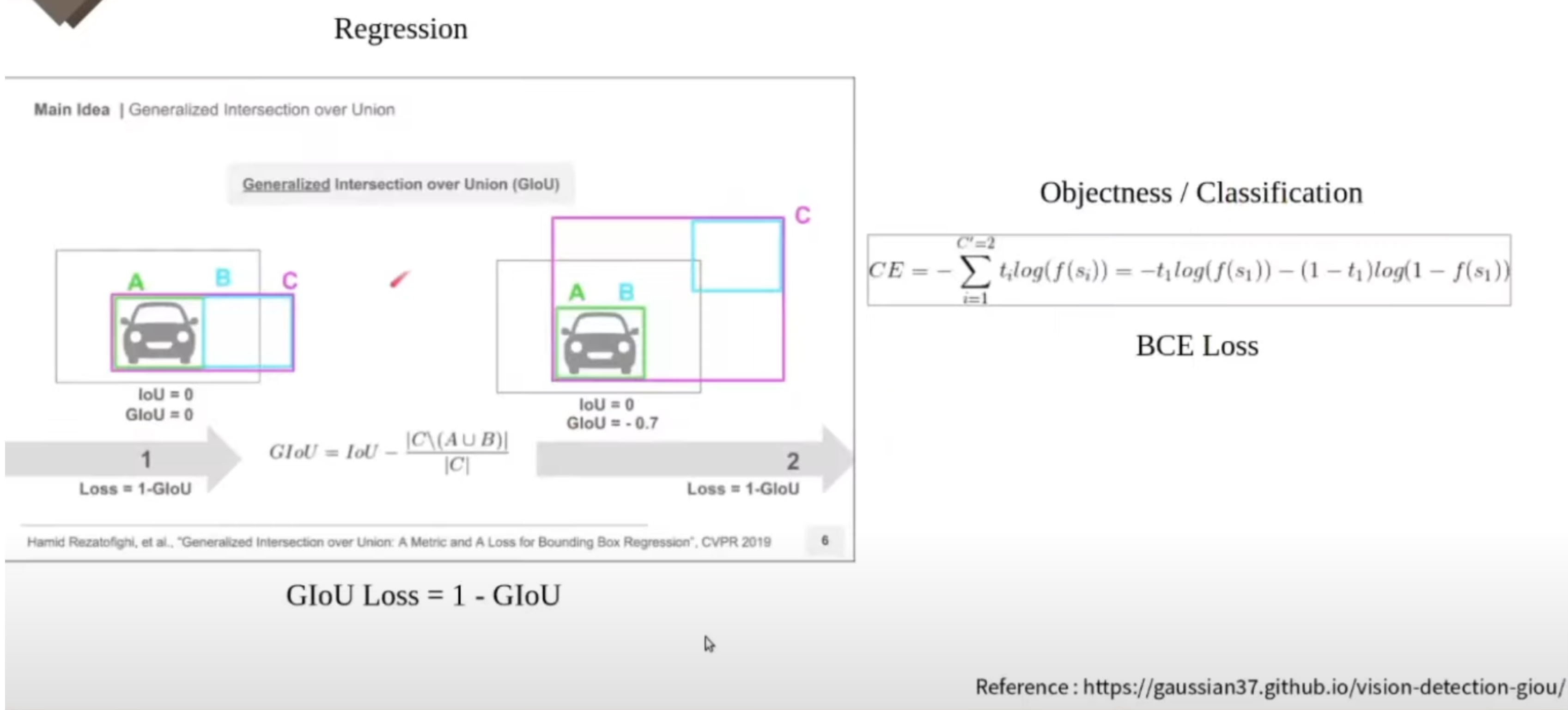 마지막으로는 Loss에 관련된 사항들을 정리를 해 보았습니다. Objectness와 classification과 regression에 대해서 프레딕션을 진행을 한다고 이 글 초반에 말씀을 드렸습니다. Objectness와 classification에 대해서는 BCE Loss를 사용하였습니다. regression에 관해서는 IoU Loss를 사용합니다. 여기서는 초록색이 GT 레이블이고 그리고 민트색이 프레딕션 한 bounding box입니다. IoU를 그대로 Loss에 사용을 하게 되면 좌측과 우측을 그 예측한 정도가 다르게 됩니다. 왼쪽 그림에서 IoU는 둘 다 0입니다. 왜냐하면 겹치는 값이 아무것도 없기 때문입니다. 이런 면들이 IoU를 그대로 Loss에 사용하기에는 좀 부적합하다고 생각을 해서 GIoU가 나왔습니다.