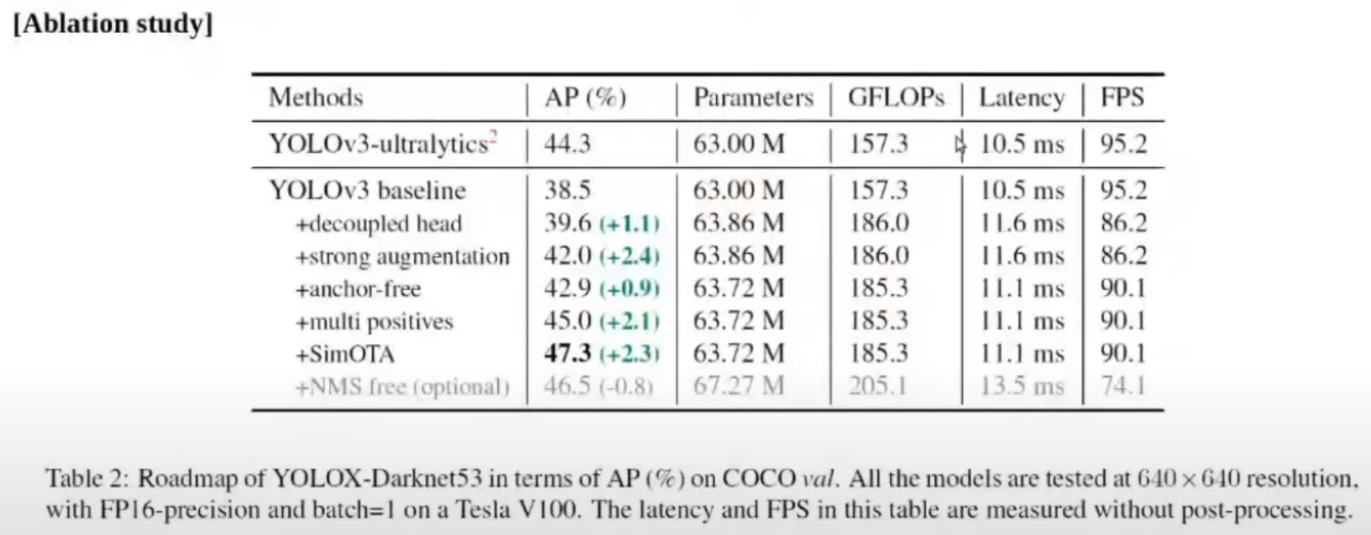 다음으로, Experiment 중 ablation study를 살펴보겠습니다. 위 표를 보시면 YOLO V3 base모델에 비해서, 앞에서 소개한 방법들을 적용하는 것이, 성능 향상에 도움이 되었다는 것이 결론입니다. 추가적으로 Anchor free 방법을 사용했을 때는 strong augmentation까지는 Anchor free방법이 적용이 되어있지 않은 것으로 보이는데, Anchor free를 적용하고 조금 더 속도가 빨라져서 계산량 부분에서 이득이 있었다는 것을 확인할 수 있었습니다. 마지막에 NMS free라는 것은 최종적으로 나온 bounding box 중에 accuracy가 높은 bounding box만 추려내는 post processing 파트입니다. 표를 보시면, Anchor free 네트워크라 해도, post processing을 적용을 하였을 때가 조금 더 AP가 향상되고, 없앤다면 낮아지는 결과를 확인을 하실 수가 있습니다.