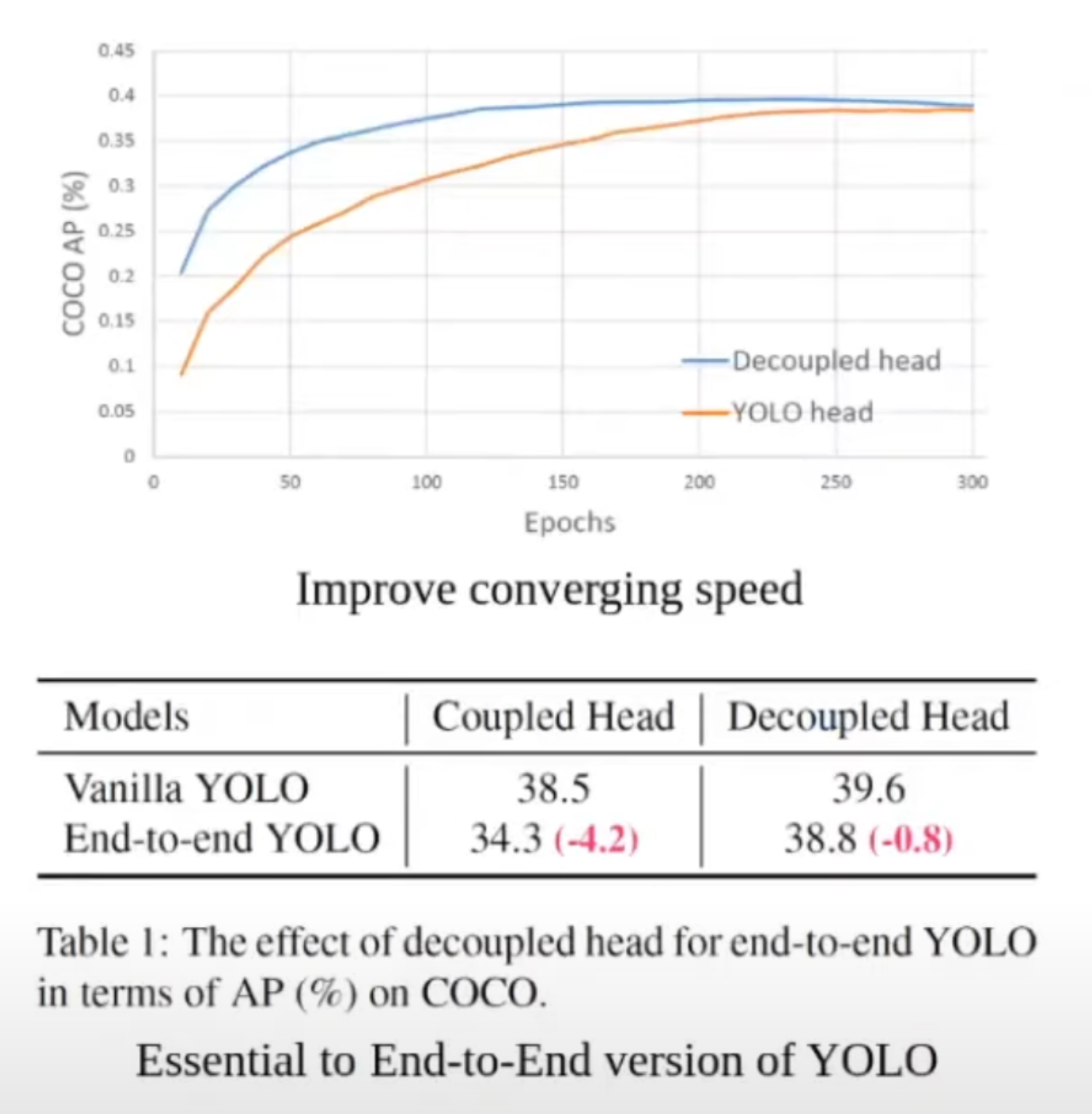 위 그래프를 보시면, Decoupled head와 YOLO head의 epoch당 AP값으로 표현된 학습 속도를 보실 수 있습니다. Decoupled head가 아무래도 조금 더 converging 속도가 빠른 것을 확인하실 수 있습니다. YOLOX에 적용한 기법 두 번째는 end-to-end로 가기 위해서는 Decoupled head가 필수적이라는 측면입니다. 위 그림의 아래 테이블은 기존의 YOLO와 Decoupled head를 사용했을 때와 기존의 YOLO 방식과 end-to-end YOLO 방식을 비교한 테이블입니다. 결과적으로는 end-to-end의 Decoupled head가 조금 더 AP값이 잘 나오는 것을 확인할 수 있습니다.