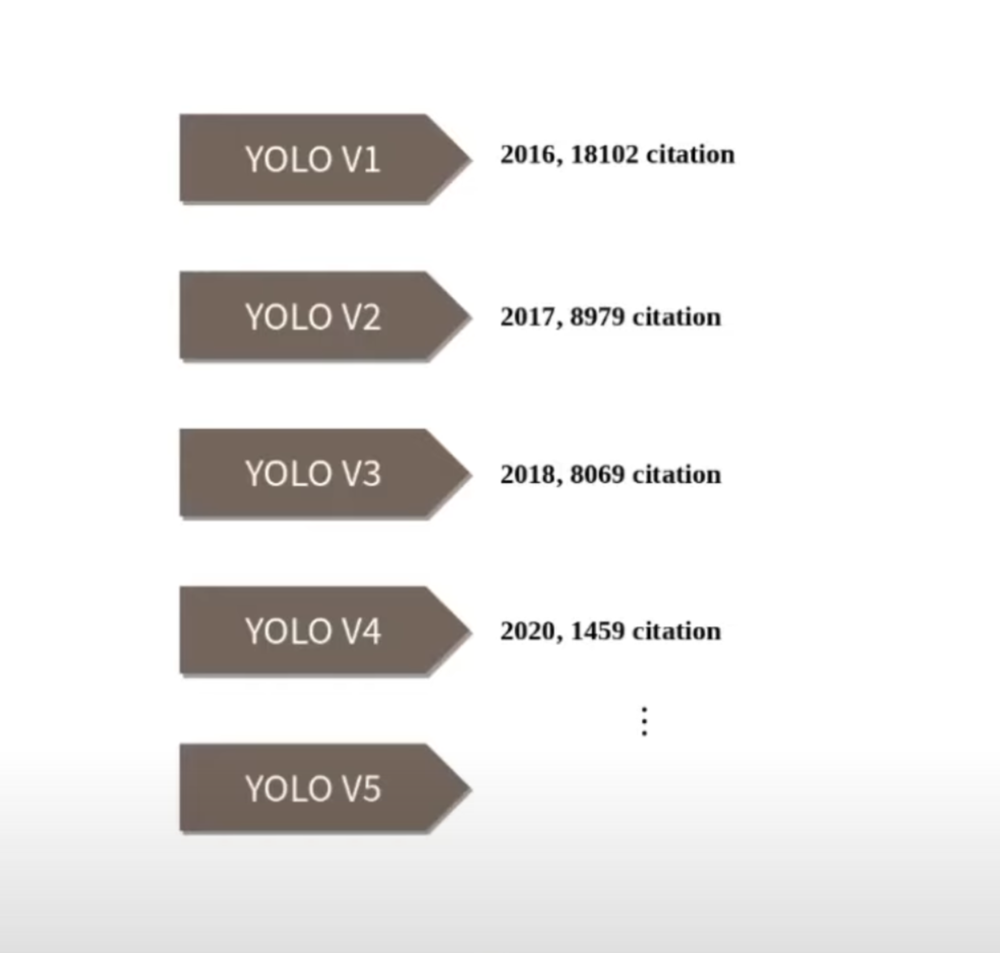 YOLO 역시 대표적인 CNN 기반의 네트워크입니다. 위 그림에서 오른쪽 숫자들은 YOLO 시리즈들의 퍼블리시 연도 그리고 citation 수를 나타내고 있습니다. 해당 논문의 citation수가 굉장히 높은 것을 확인하실 수 있습니다. detection관련 논문에서 가장 유명한 논문이라고 해도 과언이 아닌 것 같습니다.