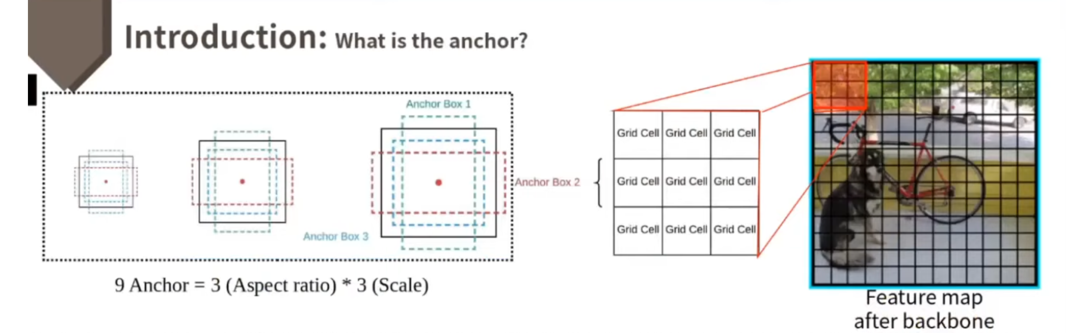 Anchor에 대해서 조금 더 자세히 알아보도록 하겠습니다. Anchor는 bounding box를 만드는 기반이 되는 값들입니다. 그래서 Anchor는 다양한 비율과 다양한 크기의 오브젝트를 좀 더 잘 찾을 수 있도록 하는 목적으로 만들어졌기 때문에, 이런 Anchor 또한 다양한 사이즈와 다양한 Aspect ratio를 가지고 있습니다. 위 그림에서 보시면, 하나의 사이즈가 세 개의 Aspect ratio를 가져서 총 아홉 개 Anchor를 가지고 있습니다. 일반적으로 9개 Anchor를 많이 사용하기에, 여기서도 예시로써 9개 Anchor를 들었습니다. backbone 후에 feature map이 위와 같다고 하면, 9개 Cell만을 보면 9개 Cell 중, 한 Cell에서는 9개 Anchor를 기반으로 bounding box를 만들어내게 됩니다. 따라서, 총 Anchor의 개수는 13 * 13이니까 169 * 9개의 Anchor가 만들어지게 됩니다.