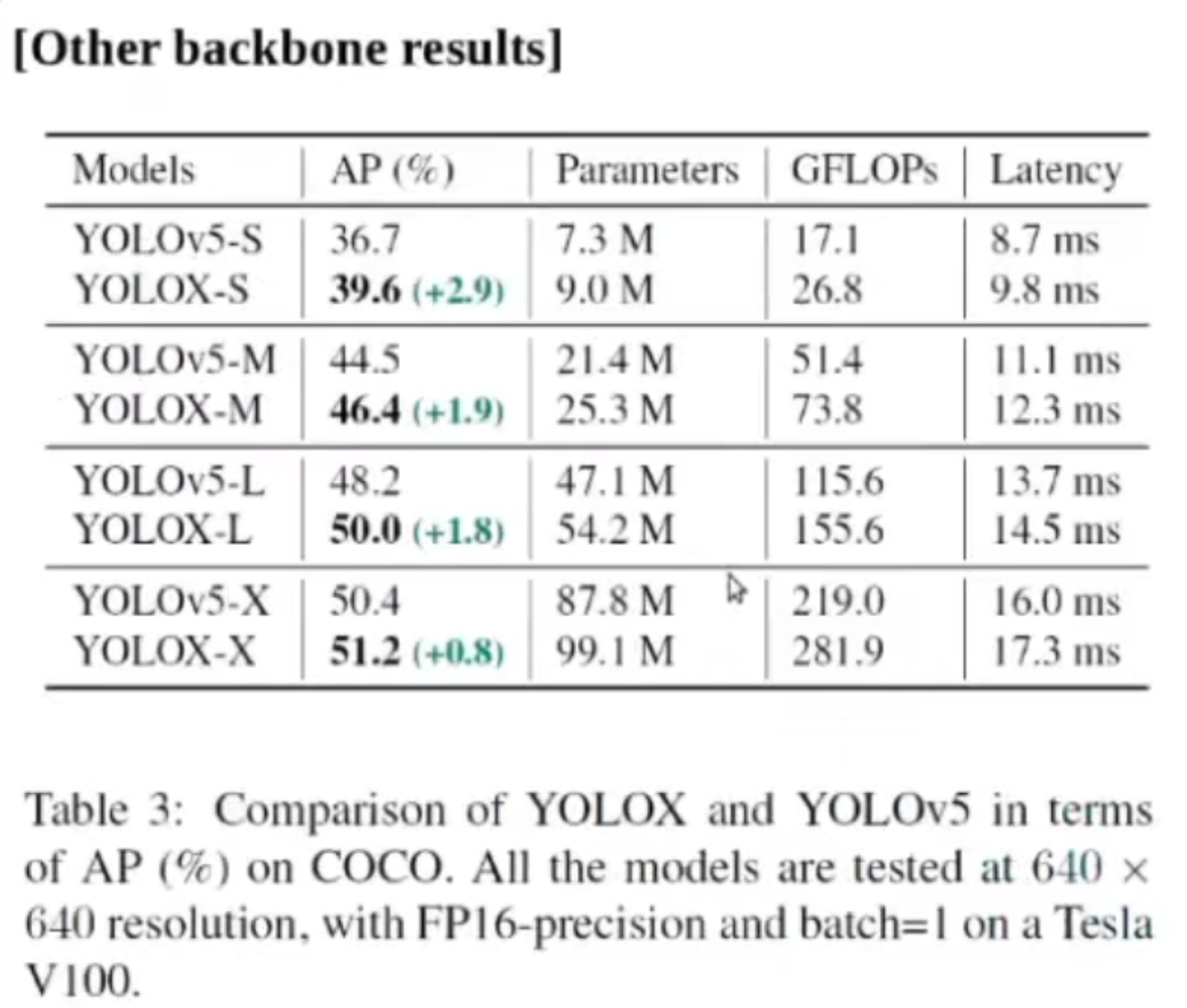 다른 backbone을 적용했을 때의 결과입니다. 이것들은 각각 그 YOLO V5를 base 라인으로 해서, YOLOX에서 제안한 방법들을 적용하였고, 각각 AP이 조금씩 올라가는 것을 확인하실 수 있습니다. 그에 따라서 파라미터도 조금씩 상승을 하고 latency도 조금씩 상승을 하는 trade off가 있지만, AP값은 조금 더 향상된 결과를 보실 수가 있습니다.