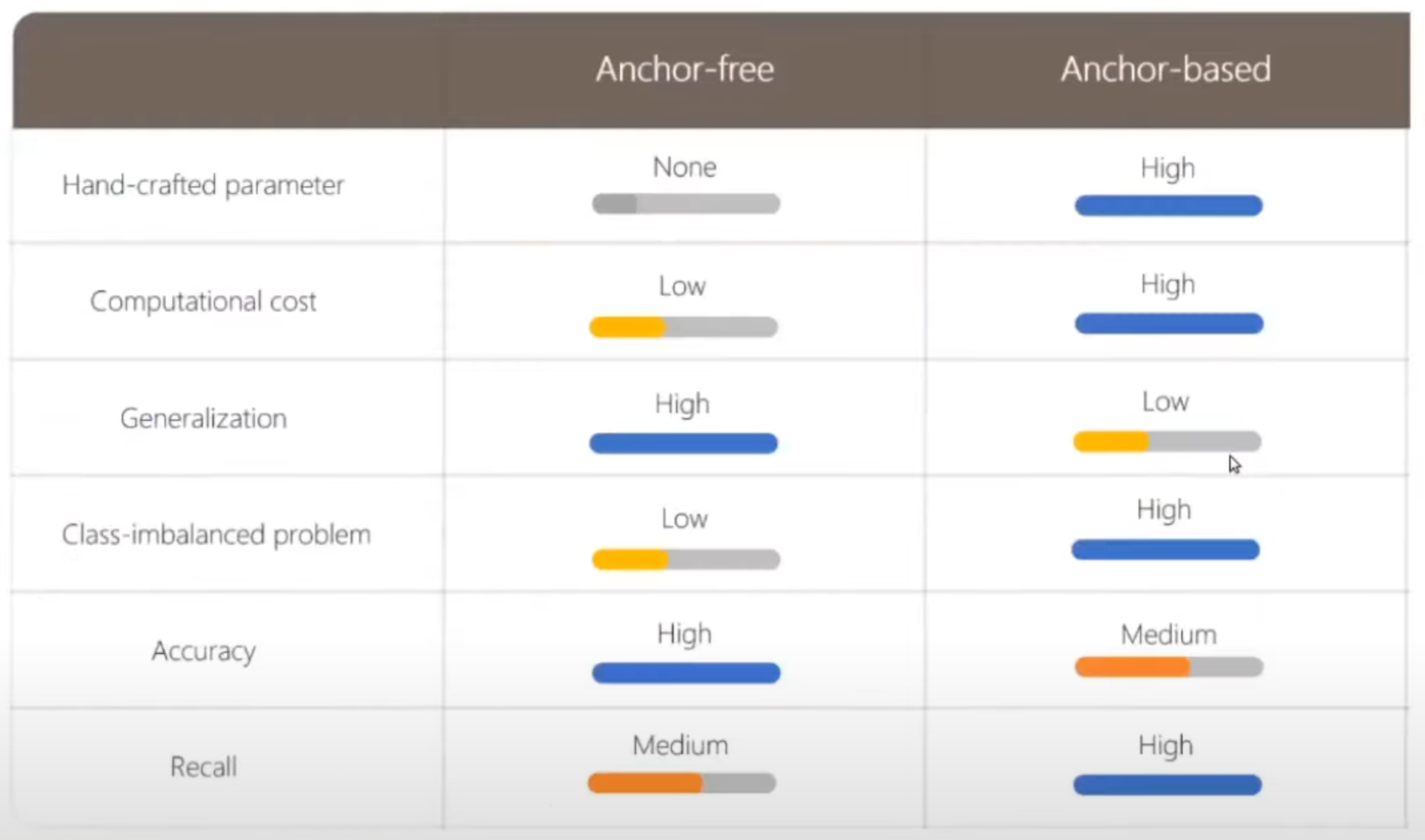 다음으로, 위 표는 Anchor free 방법과 Anchor base 방법을 사용했을 때, 결과적으로 장단점을 나타낸 표입니다. 첫 번째로는 Hand-crafted parameter입니다. Anchor는 데이터셋에 따라서 그 사용자가 직접 디자인을 해야 합니다. 데이터셋에서 가로로 긴 것이 많으면, 아무래도 Aspect ratio가 가로가 좀 더 커지는 단점이 있고, 반면에 Anchor free 같은 경우에는 불편함은 없습니다. 두 번째로 Computational cost 같은 경우에는 Anchor는 하나의 Cell에서 9개의 Anchor를 만들어 내고 anchor free는 하나의 프레딕션만 진행을 한다고 했을 때, 단순 계산만으로 9배의 차이가 나는 계산량을 생각해볼 수 있습니다. 그리고 세 번째로는 Generalization인데, Anchor는 데이터셋에 따라서 각자가 디자인하고, 그래서 데이터셋에 조금 디펜던시가 있어서 Generalization 측면에서는 Anchor free가 더 높은 측면이 있습니다. Class imbalanced problem 같은 경우에는 Anchor base는 Cell마다 9개 Anchor를 만들어 내고, 거기에서 나오는 Negative 샘플도 많기 때문에 아무래도 Anchor free 방법이 이런 문제에서는 좀 더 자유롭습니다. accuracy 같은 경우에는 사실이 모델마다 적용된 기법들이 다 달라서 anchor base랑 Anchor free와 따로 정확히 비교를 하긴 힘들겠지만 본 논문에서는 기존의 YOLO V3보다는 Anchor free가 좀 더 우세하다고 볼 수 있습니다. 마지막으로 recall에서 Anchor base는 각 Cell에서 9개를 예측을 하고, Anchor free는 1개만 예측을 하기 때문에, 좀 더 Anchor base가 recall이 높은 것을 확인을 하실 수 있습니다.