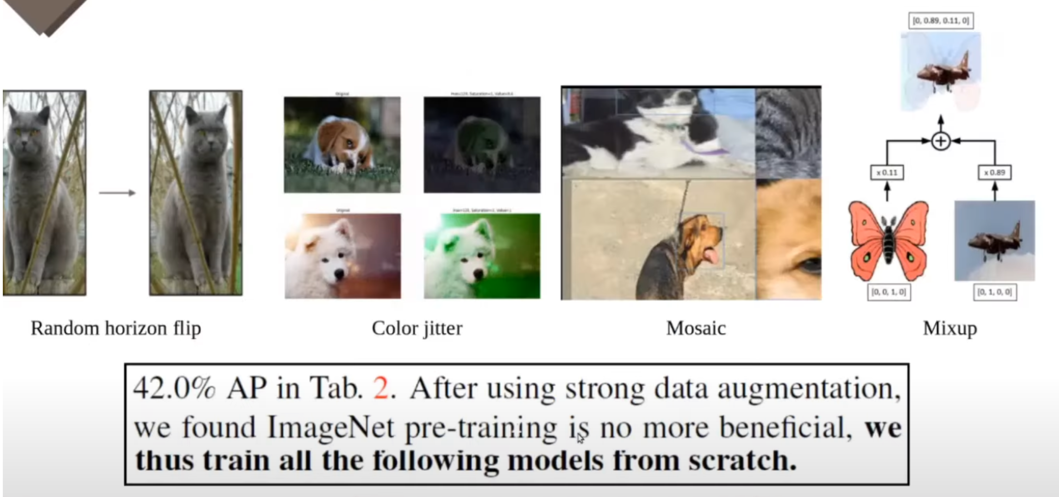 다음으로는 augmentation 방법입니다. 이 논문에서는 총 4가지의 Data augmentation 방법을 적용을 했습니다. random horizon flip과 원본 영상의 hsl을 변경하여 증강시키는 클러스터라는 방법, 원본 이미지 외에 3개의 추가적인 사진을 섞는 Mosaic이라는 방법, 마지막으로는 그 이미지랑 레이블의 다른 것을 조금씩 섞는 Mixup이라는 방법을 사용했습니다. 오른쪽 그림에서 비행기라는 레이블에 나비라는 레이블을 조금씩 섞어서 임시로 만들고, 레이블도 만든 것을 확인하실 수 있습니다. 놀라운 점 중 한 가지는, 이 논문의 저자는 강력한 Data augmentation을 써서, pre-training 된 weight를 써도 성능 향상이 별로 안 되었다고 합니다. 그래서 논문에서는 스크래치부터 학습을 했다고 언급하고 있습니다.