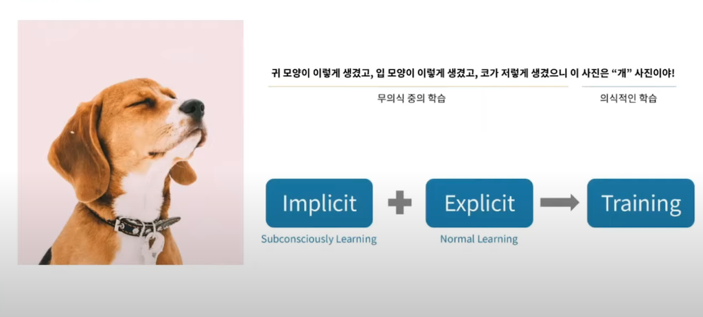 Explicit Knowledge와 Implicit Knowledge가 어떻게 활용할 수 있을지 살펴보겠습니다. 사람이 학습을 할 때 이미지를 보여 주고 이것은 ‘개’라고 정답을 알려줍니다. 이것이 ‘개’라고 학습하는 것은 의식적인 학습입니다. 사람들은 무의식 중에 눈, 코, 입이 위 개 사진과 같이 생긴 것은 ‘개’라는 학습을 진행합니다. 이것은 무의식 중에 일어나게 되는 학습입니다. 생각해 보면 이러한 정보를 학습할 때, 디테일하게 어떻게 생겼는지 인식하는 게 아니라, 추상적인 개념으로 그리고 무의식적으로 정보를 학습을 합니다. 앞에서 언급한 무의식적으로 학습하는 것을 Implicit learning이라고 합니다. 일반적으로, 정답과 이미지를 매칭 해서 학습하는 것을 normal learning이라고 하고, 이에 대비해서 무의식적으로 학습하는 것을 Explicit learning이라고 부릅니다.