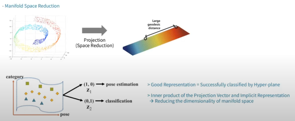 Manifold Space Reduction 같은 경우는 고차원의 Manifold를 Projection 해서, 저차원의 Manifold로 Projection 하는 것을 의미를 합니다. 이런 과정을 통해서 hyper-plane을 보다 더 잘 찾을 수 있게 하도록 딥 뉴럴 네트워크가 진행합니다. 그래서 저자들은, 좋은 Representation는 데이터를 잘 나누는 hyper-plane이 존재하고, Projection 벡터와 Implicit Knowledge의 inner product를 통해서 차원 축소가 가능하다고 했습니다. 이 부분을 좀 정리해서 말씀드리면, Implicit Knowledge가 Constant 텐서로 여길 수 있으므로, 다른 테스크를 적용할 때, 단순한 Constant 텐서와 함께 연산을 해서 다른 태스크에 적용할 수 있다고 말할 수 있습니다.