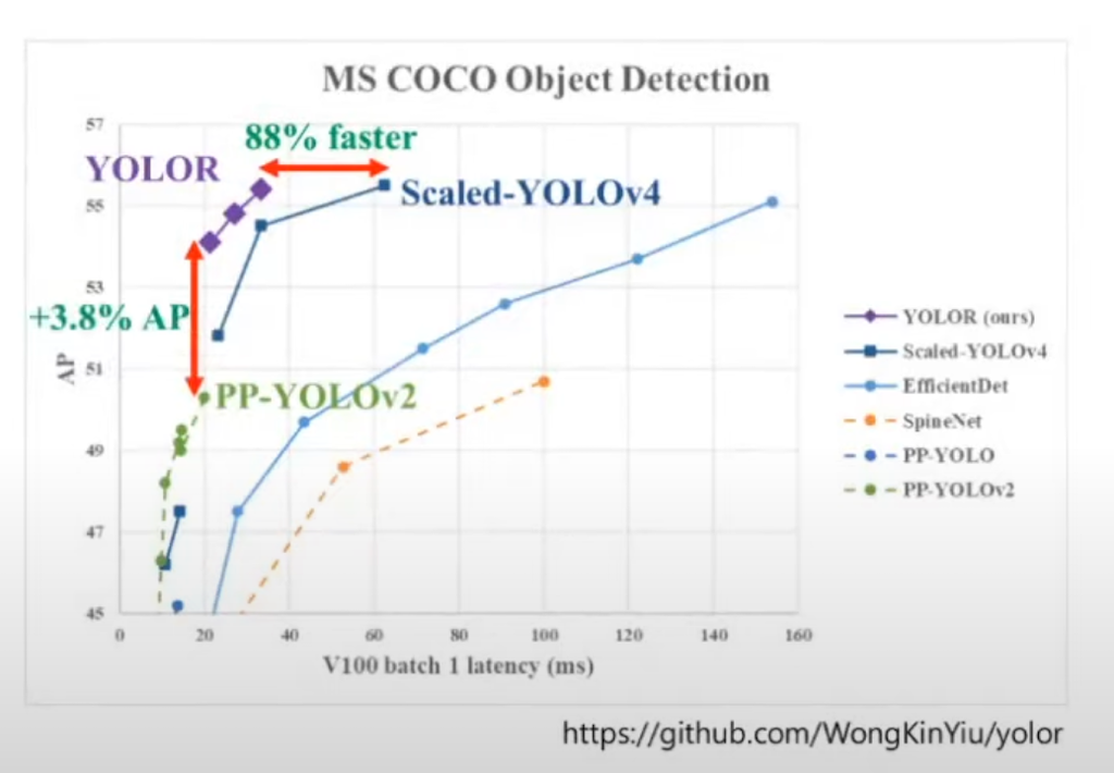 위 그래프에서 볼 수 있듯이 저자는 YOLOR이 MS COCO 데이터셋에서 Object Detection의 결과가 다른 모델에 비해서 좋다고 주장을 하고 있습니다. 하지만 개인적으로는 타 모델들에 비해 빠르고 높은 성능을 보여주는 것은 분명한데, 수치에 대해서 조금 잘못된 해석을 한 게 아닌가 라는 생각을 하고 있습니다. 이 부분에 대해서는 Result 파트에서 다시 한번 보겠습니다.