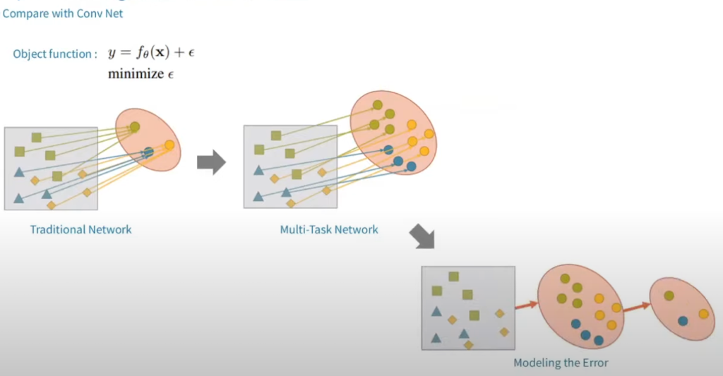 실제로, Unified Network가 어떻게 작동하는지 확인해 보겠습니다. 논문에서는 ConvNet의 objective function을 분석을 했습니다. objective function은 타깃 y와 뉴럴넷의 결과의 에러를 최소화하는 방향으로 학습을 진행을 합니다. 이 과정에서 일반적인 네트워크는 같은 클래스의 이미지를 하나의 값으로 가도록 학습을 시킵니다. 멀티 테스크를 위해서는 여러 가지 테스크마다 정답이 따로 존재하기 때문에, 여러 가지 정답으로 귀결되도록 학습을 시켜야 합니다. 저자는 멀티태스크를 위해서 에러 함수를 모델링하는 것이 좋다고 말했습니다.