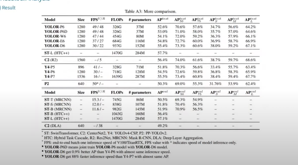 SOTA 모델과 비교했을 때, 성능 자체가 매우 뛰어나다고 보기 어렵습니다. YOLOR자체는 55% 인데 다른 Swin 트랜스포머나 CenterNet 등을 보면 더 높은 것을 확인할 수 있습니다. 저자들이 말하는 것은, YOLO가 약간의 성능 저하로 real time inference를 구현한다는 점에서 의미가 있듯이, 약간의 성능 저하로 real time을 비슷한 accuracy로 구현 수 있다는 점에서 YOLOR이 의미를 갖는다고 말합니다. 여기까지가 본 논문 내용입니다.