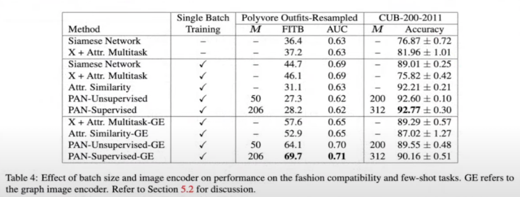 이전에는 이미지 유사도에 대한 batch 크기와 매개 변수의 차이에 대한 일관성이 없었지만 해당 연구에서는 whole 트레이닝을 하거나 또는 mini batch를 사용해서 정확도 차이를 서술했습니다. 그리고 image encoder에 있어서도 Graph encoder와 단순한 CNN이 Siamese network의 차이를 비교 서술했습니다. Polyvore Outfits에서는 PAN GE encoder가 단순히 그냥 종을 분류하는 이미지 데이터셋에서는 Siamese 보다는 PAN 기반 네트워크가 정확한 것을 확인할 수 있습니다.