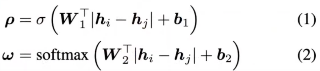 image encoder를 통해서 나온 h1과 h2를 통해서 similarity score p와 relevance score weight가 구해지고, 이 hidden layer의 차이로 similarity score와 relevance weight도 구합니다. 그리고 여기서 W1과 W2, b1과 b2가 학습이 되고 최종 유사도의 값 p는 다음 값의 합입니다.