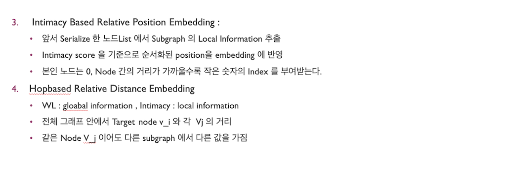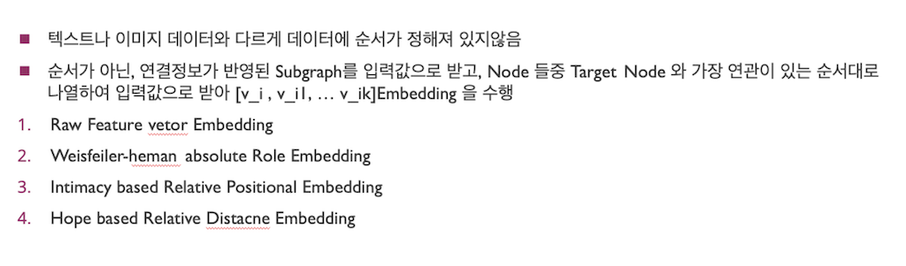 Graph 데이터는 이미지나 텍스 데이터와 같이 같지 않게 순서가 정해져 있지 않습니다. 그래서 노드들 중에 타겟 노드와 가장 연관성이 높은 노드들로만 순서대로 탑K개 순서로 입력받아서 임베딩을 진행합니다. 임베딩은 Raw Feature vector Embedding, Weisfeiler-heman absolute Role Embedding Intimacy based Relative Positional Embedding, Hope based Relative Distance Embedding 이렇게 네 가지를 통해서 진행이 됩니다.