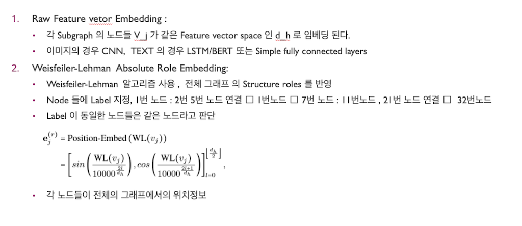 첫 번째로 Raw Feature vector Embedding은 각각 sub Graph의 노드 V_j를 모두 같은 크기의 d_h의 피쳐 벡터 스페이스로 임베딩을 하는 과정을 말합니다. 이 과정은 데이터 형태에 따라서 다르게 준비가 됩니다. 이미지의 경우 CNN, 텍스트의 경우 LSTM 또는 BERT, 그 외 다른 데이터 같은 경우는 그냥 fully connected layer를 사용해서 진행이 됩니다. 그리고 이렇게 진행된 벡터들을 Weisfeiler-heman absolute Role Embedding이라는 과정을 진행하게 됩니다. 일명 WL 알고리즘이라고 부르기도 하는 이 알고리즘은 전체 Graph에 structure roles을 반영하기 위해서 진행한다고 합니다. 그래서 각 모든 노드들에게 숫자를 지정해주고, 예를 들어 1번 노드와 연결된 노드의 숫자들을 다시 1번 노드의 값이라고 지정해주는 방식입니다. 구체적으로, 1번 노드와 연결된 노드가 2번 노드와 5번 노드라고 하면 1번 노드의 값은 7번 노드가 됩니다. 이 과정을 이 논문에서 두 번 반복했습니다. 이렇게 두 번 반복한 값에 sin과 cos을 적용해 준 값을 Weisfeiler-heman absolute Role Embedding이라고 합니다. 이렇게 임베딩 된 값들은 각 노드의 전체 Graph에 대해서 structure roles를 반영하고 있습니다.