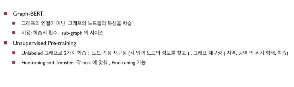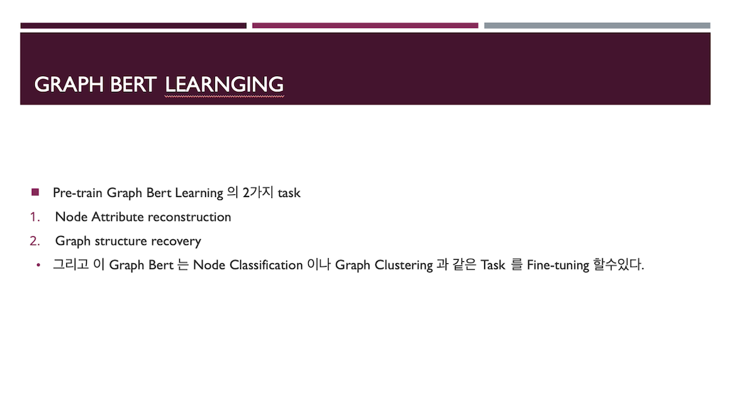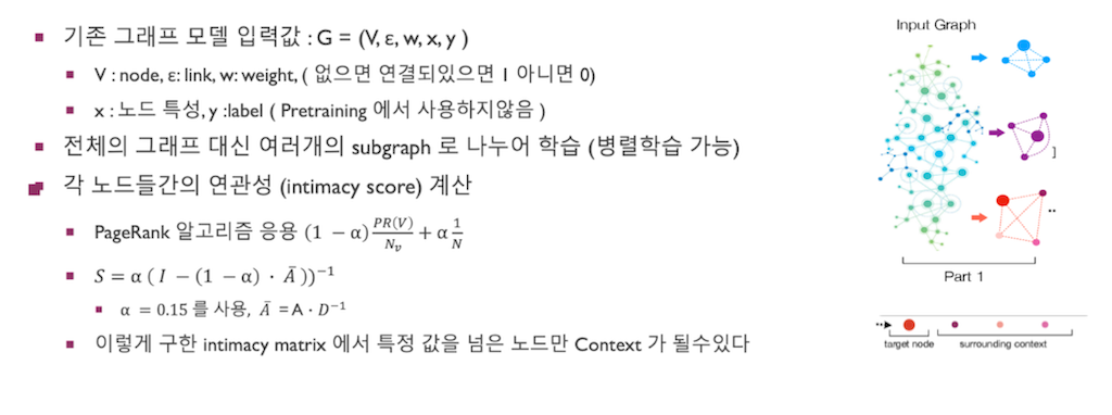 이 모델을 짧게 summarize 하자면 모델을 전체 Graph와 그의 연결이 아닌 subGraph로 나누고 그 sub-Graph안에 노드들의 특성을 따라 학습합니다. 그리고 그 해당 모델은 기존 모델과 다르게 학습의 횟수와 sub-Graph의 사이즈만 비용이 들어서 기존 모델보다 비용이 적게 든다는 장점이 있습니다. 그리고 자연어처리 BERT 모델이 가려진 단어를 찾고 다음 문장의 어떤 문장이 들어오는지 확인하는 사전 학습 과정처럼 이 모델에서도 사전 학습 과정이 두 가지가 있습니다. unlabeled 된 Graph로 각 노드의 속성을 재구성하거나 Graph를 재구성하는 두 가지 방법으로 pre training을 진행하고 다른 사전 학습 모델과 마찬가지로 fine-tuning을 진행하여 여러 가지 테스크에 적용 가능합니다.