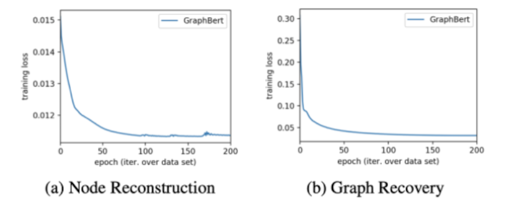 앞서 설명드린 대로 각각 데이터들을 동일한 순서대로 학습을 진행하고 epoch을 200번을 두고 노드 reconstruction과 Graph recovery의 테스크를 진행했을 때 동일하게 트레이닝 로스가 줄어드는 것을 확인할 수 있습니다.