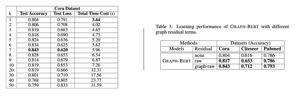 다음으로는 모델을 sub Graph 사이즈 K 값에 대해서 Cora의 데이터를 가지고 비교했을 때 Cora의 경우 K의 sub Graph 사이즈가 k가 7일 때 가장 정확한 테스트 accuracy가 나왔기 때문에 해당 데이터로는 k를 7로 지정하고 학습을 진행하였다고 합니다. 그리고 프리 트레인 과정에서 앞서 Residual를 추가해주는 부분이 있었는데 그 Residual을 추가 해주는 것에 대한 영향을 확인했을 때, 모든 데이터에서 Graph와 Residual을 추가해줬을 때가 더 높은 정확도가 나오기 때문에, Graph와 Residual을 추가하는 방식으로 해당 모델에서 진행을 하였습니다.