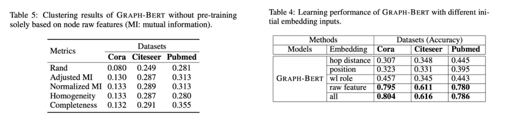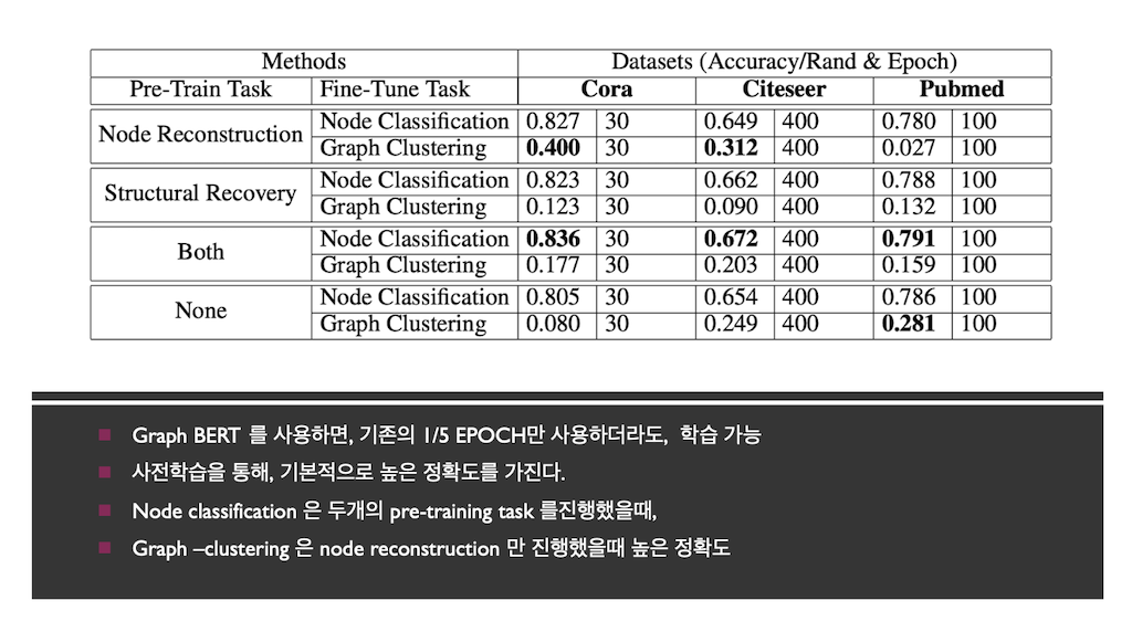 그리고 마지막으로 기존 Graph의 BERT 대신 프리 트레인 되지 않은 모델을 사용했을 때 대부분의 데이터셋에서 낮은 정확도가 나온 반면에 Graph BERT를 진행하고, 각각의 파인튜닝 테스크를 진행했을 때 BERT를 사용하지 않은 모델들보다 epoch을 훨씬 적게 사용하더라도 학습이 가능하고 높은 정확도를 가진다고 합니다. Node Classification은 두 개의 프리 트레인 태스크를 진행했을 때 가장 높은 정확도를 가지는 반면에 Graph Clustering은 프리 트레인 테스크만 진행했을 때 더 높은 정확도를 가진다는 걸 확인할 수 있었습니다.