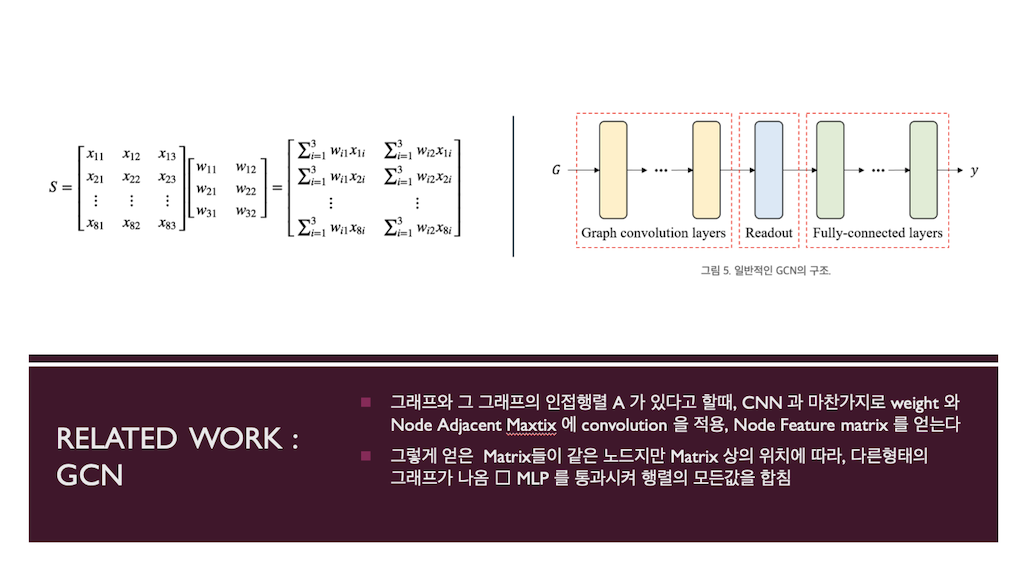 Graph-BERT 모델에 연관이 있는 모델은 GNN 모델 중에 Graph convolution 네트워크 모델이 있고, Graph의 각 노드들에 연관성을 가진 Adjacent Matrix를 웨이트 값을 convolution을 적용해서 노드 피쳐 Matrix를 얻는 과정이 있습니다. 이렇게 얻은 Matrix 값들은 서로 연관이 있기 때문에 Matrix상의 위치가 같은 노드 와의 연결이지만 Matrix상에서 위치가 달라지는 현상이 발생하는데 이 현상을 줄이기 위해서 Readout이라는 Matrix를 더해주는 과정을 한번 거친 후에 다시 한번 fully connected layer를 적용하여 진행하는 것이 일반적인 GCN 모델의 구조입니다. 그리고 GCN 모델을 응용한 것이 Graph transformer attention 모델인데 self attention 기반의 i번째 노드에 대한 Matrix와 다음 연관이 있는 j번째 노드의 Matrix의 각각의 가중치를 곱해준 값을 더 하고 Relu를 해준 값을 관계 값으로 구하는데 이 Matrix 사이에 모든 노드의 관계 값을 합쳐 주는 값을 a라고 하고, a를 모든 convolution 네트워크 레이어에 적용해주는 모델을 Graph transformer attention 모델이라고 합니다.