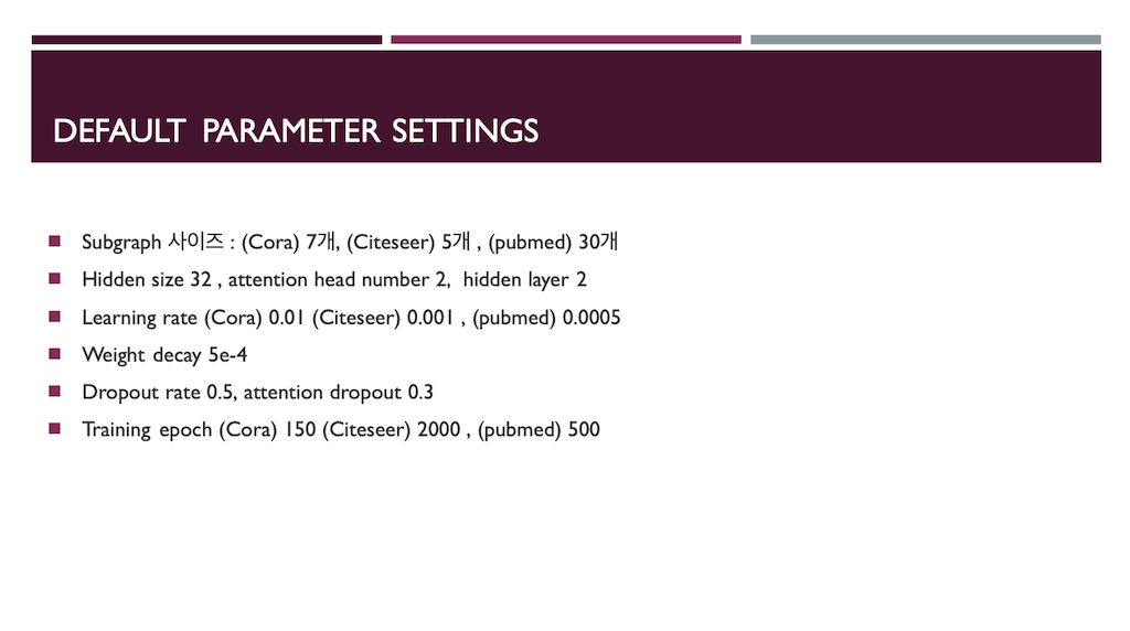 다음으로 이 논문의 experiment 부분입니다. 해당 논문은 Graph 데이터로 Cora, Citeseer, Pubmed 이렇게 세 개의 데이터를 사용하였습니다. 각 데이터는 Cora는 일곱 개의 서클, Citeseer는 다섯 개 Pubmed는 30개의 sub Graph 사이즈를 사용했다고 합니다. 그리고 히든 레이어의 길이는 32, attention 헤드는 2개 그리고 히든 레이어 개수도 두 개 사용했습니다. Learning rate는 각각 데이터에 대해서 Cora 0.01 , Citeseer는 0.001, pubmed 0.0005 그리고 weight decay는 동일하게 0.0005 그리고 Dropout rate도 동일하게 0.5 그리고 Training epoch는 Cora의 경우 150, Citeseer 2000 epoch 그리고 pubmed는 500 epoch을 사용하였다고 합니다.