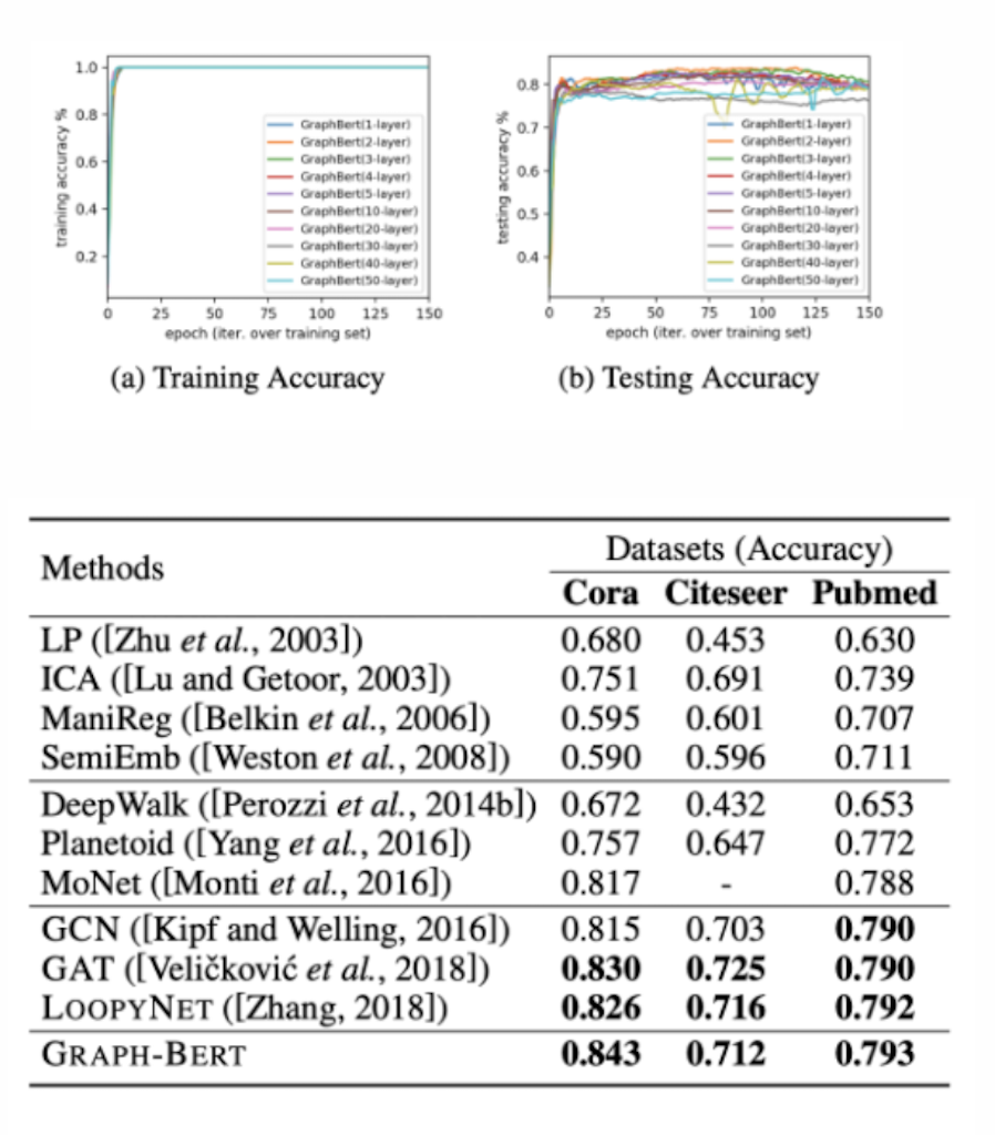 Graph BERT는 다양한 테스크에 적용할 수 있는데 기존 다른 모델의 레이어의 깊이가 깊어질수록 suspended animation problem 이 있는 것에 비해, Graph BERT는 50 가지의 Graph 깊이를 늘려도 학습이 계속 진행되고 있는 것을 확인할 수 있습니다. 그리고 다른 모델보다 모든 데이터에서 다른 GNN 모델들보다 Graph BERT가 모든 데이터에서 동일하게 가장 높은 정확도가 나온다는 것을 확인하였습니다.
