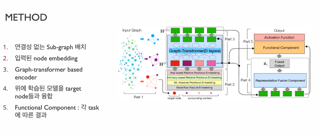 다음으로, METHOD 부분을 살펴보겠습니다. 본 논문의 모델은 전체 Graph를 sub Graph로 나누고 그 각각의 sub Graph를 타겟 노드와 가장 연관이 높은 노드 k개를 선택한 후, 그 노드들에 대해서 임베딩을 진행하고 그렇게 임베딩이 진행된 Matrix에 대해서 Graph 트랜스포머를 진행합니다. 이렇게 나온 결과물을 Readout 과정을 통해서 모두 합쳐 주고 각각의 테스크에 맞춰서 출력합니다.