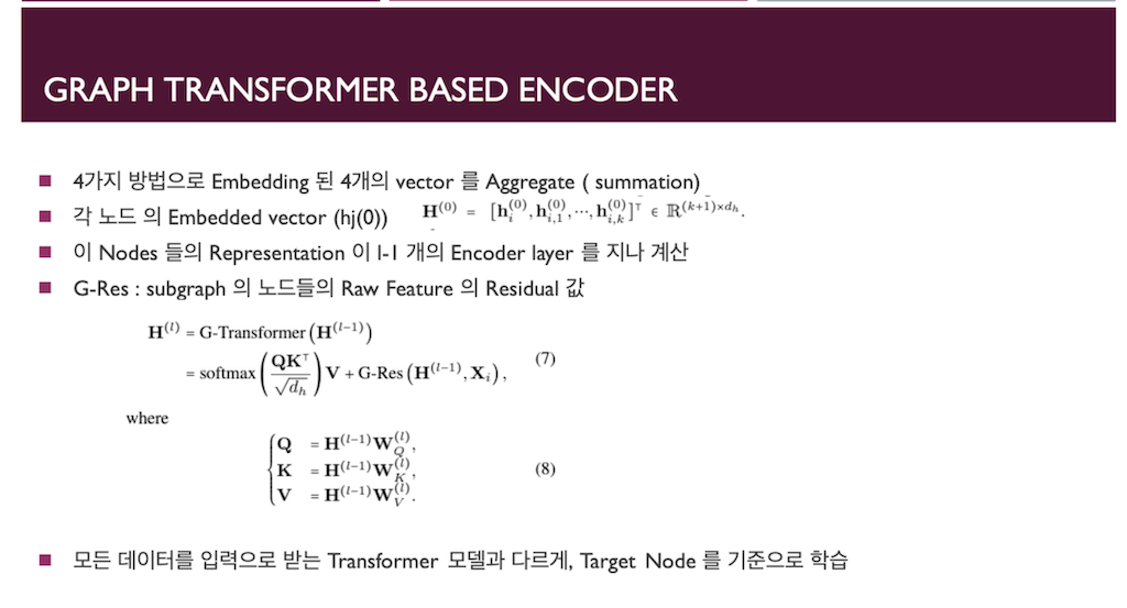 앞에서 설명드린 네 가지 방법으로 나온 각각의 임베딩을 전부 다 더해줍니다. 이 노드들의 전체의 Matrix를 L-1개의 레이어의 Graph 트랜스포머를 거치게 됩니다. Graph 트랜스포머는 앞서 설명드린 GCN 모델에 attention을 곱해주는 레이어를 L-1개 지나고 추가적으로 이 모델에서는 G-Res라는 Residual 값을 더 해줍니다. Residual 값은 아웃풋 값과 각각의 노드의 기존 Raw Feature값을 빼준 값을 Residual값을 가져 빼준 다음에 이 전체 모델의 Residual로 더해주는 형식으로 학습을 합니다. 그리고 마지막 타겟 노드를 기준으로 된 representation을 갖고 싶기 때문에 기존의 GCN 모델에서 ReadOut레이어를 적용해줘서 전체 Matrix를 다 더해줍니다. 여기서는 ReadOut 대신 Fusion 레이어를 진행해서 각 노드의 평균을 더하는 대신 평균을 진행해 줍니다.