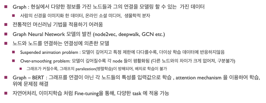 Graph는 현실에서 다양한 정보를 가진 노드들과 그 연결성을 모델링화할 수 있는 형태의 데이터를 말합니다. 예를 들면 사람의 신경을 이미지화하거나 온라인 소셜미디어에 친구관계라든가 생물 분자와 같은 연결성을 가진 형태의 데이터를 Graph라고 합니다. Graph는 전통적인 머신러닝의 기법을 적용하기 어렵다는 점이 있는데 그래도 지난 몇 년간 node2vec, deepwalk, GCN 같은 Graph 뉴럴 네트워크 모델의 발전이 있었습니다. 그런데 이 모델들은 문제가 있는데, 모델들을 모두 노드와 노드를 연결하는 그 연결성에 학습을 진행하는 모델이기 때문에 모델이 너무 깊어지거나 어느 정도 특정 제한이 넘어가면 더 이상 트레이닝 데이터에 대한 학습을 진행하지 않고 또는 노드들이 평활화가 돼서 다른 노드들과 차이가 크게 없어져서 Over-smoothing problem 이 발생하여 더 이상 학습이 불가능해지는 현상이 일어났습니다. 또는 Graph가 커지면 커질수록 Graph 병렬 학습이 불가능하기 때문에 학습이 어렵다는 단점이 있습니다.