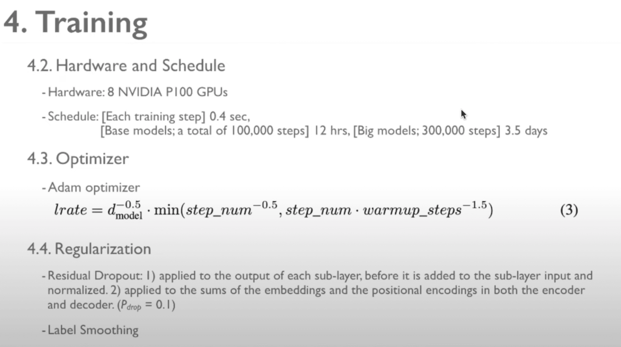 하드웨어는 위와 같고, optimizer는 Adam을 사용했으며 regularization은 residual dropout을 이용해서, 랜덤 하게 sub layer를 select 했다고 할 수 있고, Label smoothing을 통해서, 정확하지 않은 input일 수 있지만, accuracy는 조금 더 높일 수 있습니다.