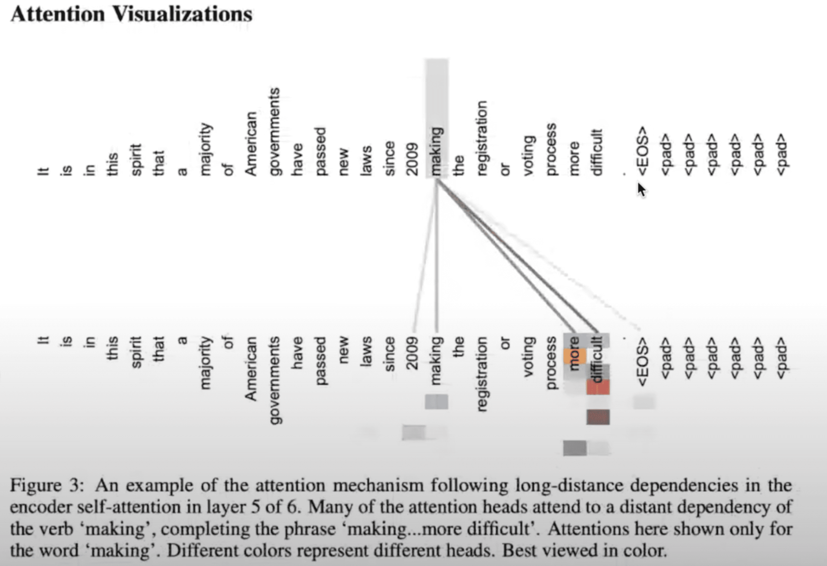 위 그림은, Encoder의 예시로 visualization을 한 것입니다. 각각의 사각형은 헤드라고 생각을 하시면 될 것 같습니다. 그래서 여기서 총 여덟 개의 헤드가 있고, 위 그림에서 making이 more와 difficult 단어와 다른 단어보다 더 연관성이 있다고 볼 수 있습니다.
