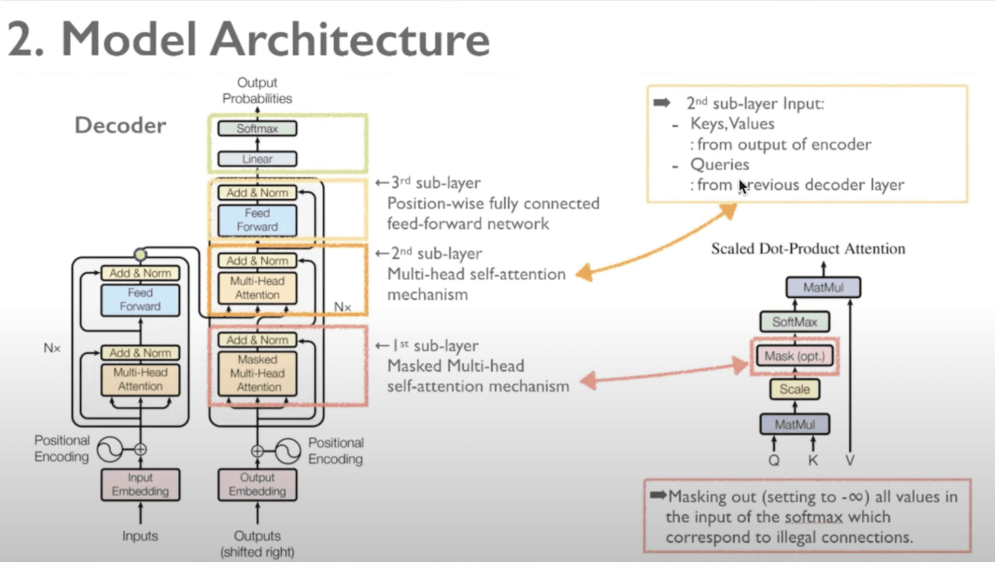 다음으로, decoder 부분을 살펴보겠습니다. Encoder 파트에서 나왔던 값들 중에 key와 value를 사용해서, 중간에 multi head attention에 넣을 것인데요. 디코더에서의 multi head attention 첫 번째 레이어가 인코더와 다른 점은 mask를 사용한 것입니다. mask를 사용한 이유는 position 때문입니다. 옆에 있는 단어가 아닌 단어들에 거의 마이너스 무한대의 값을 주어서, 연관성이 있는 값들만 뽑아내기 위해서 마스크를 사용한 것으로 보입니다.
