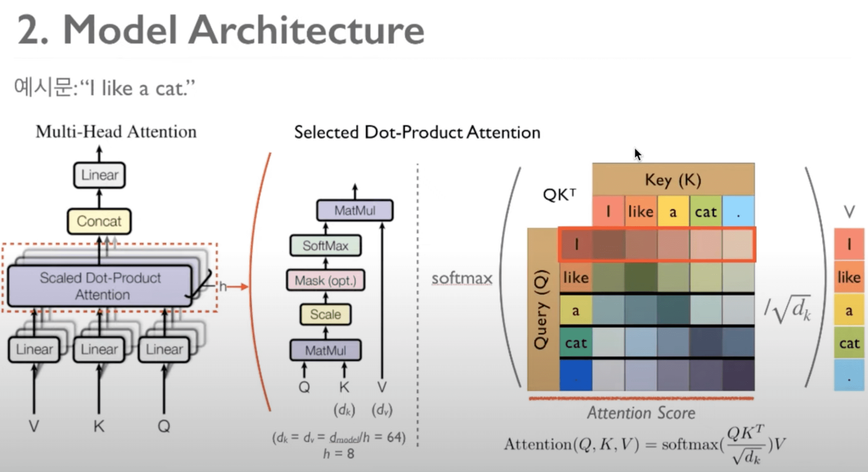 Multi-Head Attention 부분이 Transformer에서 핵심적인 부분이라고 볼 수 있습니다. 먼저 Scaled Dot-Product Attention에 대해서 살펴보도록 하겠습니다. 앞에서 보셨던 임베딩을 통해서 Q, K, V 세 가지를 얻게 됩니다. 여기에서는 각각의 K와 V의 dimension은 64가 되고 그 이유는 h(head)가 총 8개로 구성되어 있기 때문입니다. 중간 그림의 MatMul은 Dot-Product를 진행하는 것으로 볼 수 있습니다.