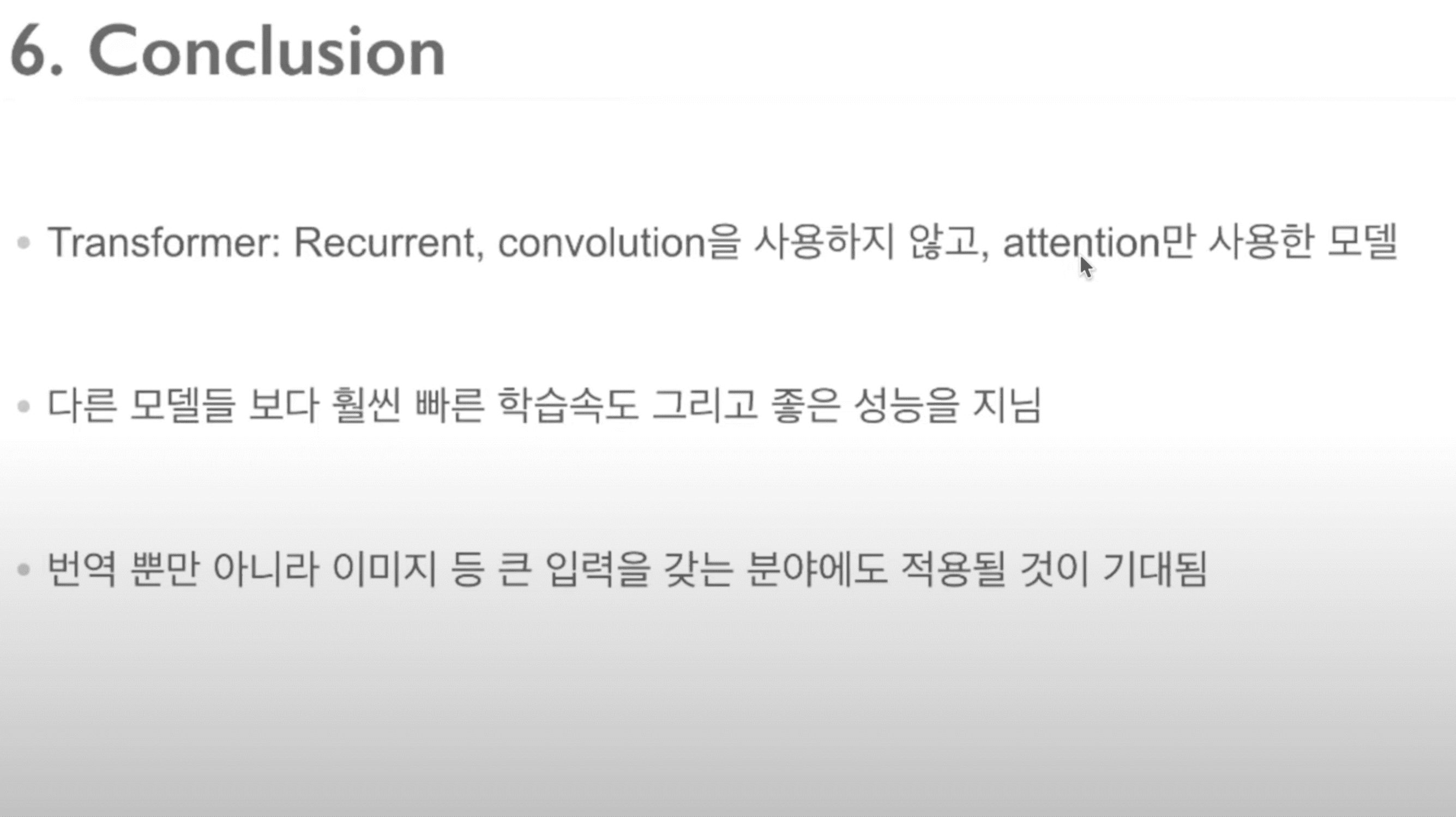 결론적으로 Transformer는 recurrent, convolution을 사용하지 않고, attention만 사용한 모델입니다. 또한, 다른 모델들보다 훨씬 빠른 학습 속도와 좋은 성능을 지닙니다. 마지막으로, 번역뿐만 아니라 이미지 등 큰 입력을 갖는 분야에도 적용될 것이 기대된다는 것입니다.